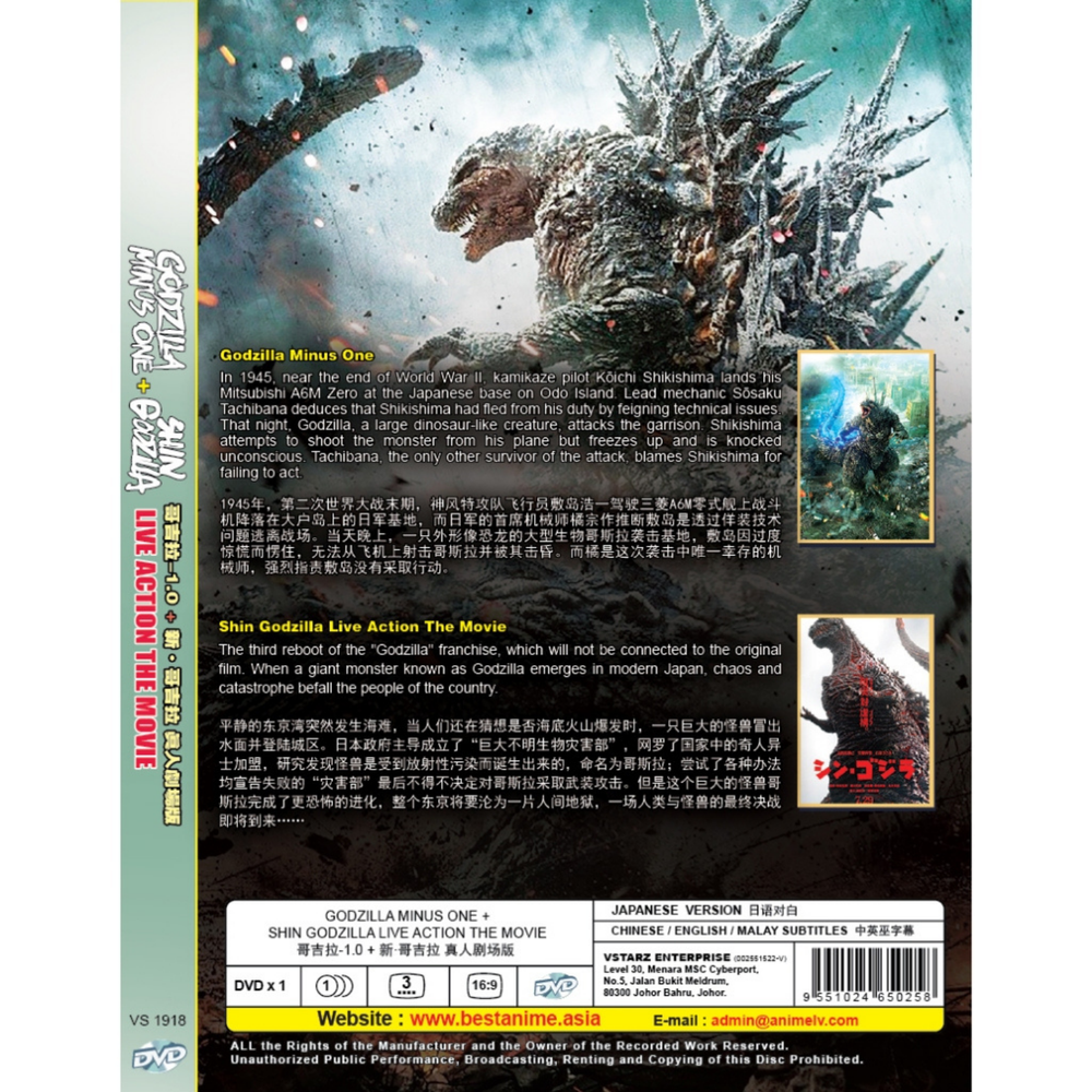 Godzilla Minus One + Shin Godzilla Live Action The Movie 2023 Synopsis: "Godzilla Minus One Post-war Japan is at its lowest point when a new crisis emerges in the form of a giant monster baptized in the horrific power of the atomic bomb. Shin Godzilla All of the sudden, a giant creature immediately appears, destroying town after town plunged into chaos with its landing reaching the capital. This mysterious giant monster is named "Godzilla" ================================================================================================================================ DVD DETAILS Disc Quantity : 1 Disc (2 Movies) Version : Japanese Subtitle : English/Chinese/Malay Running Time : Approx. 240 Minutes Format : DVD Genres : Action, Tokusatsu, Horror, Sci-Fi ================================================================================================================================ Shipping & Handling Details Item Ship within 3 days after full payment. Item is well packed using bubble padded envelope/boxes to protect product from damages The product will be shipped using Economy Trackable Shipment ETA 10-15 business days Undelivered parcel due to wrongly enter address/change of address will not be entertained ================================================================================================================================ Please contact us before leaving any bad FEEDBACKS or DISPUTES.