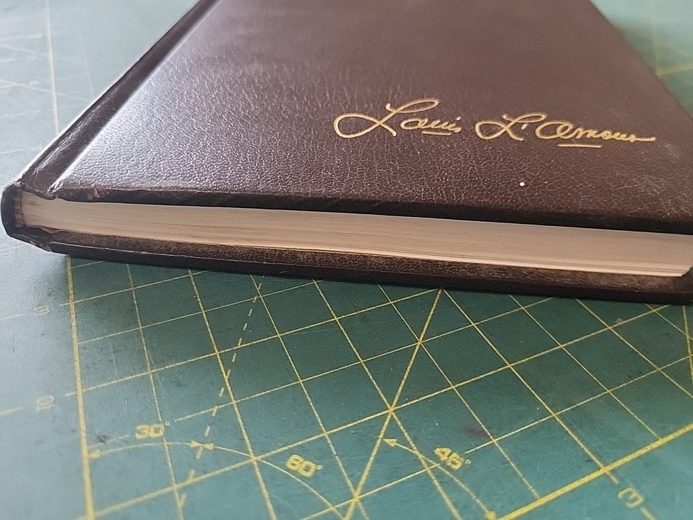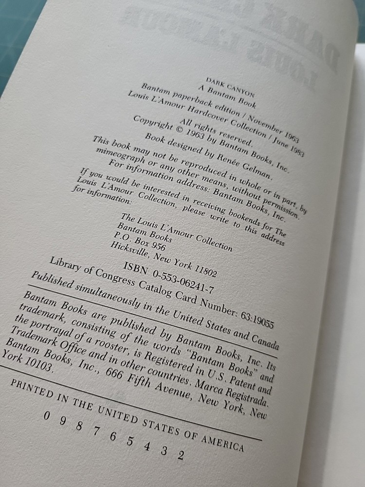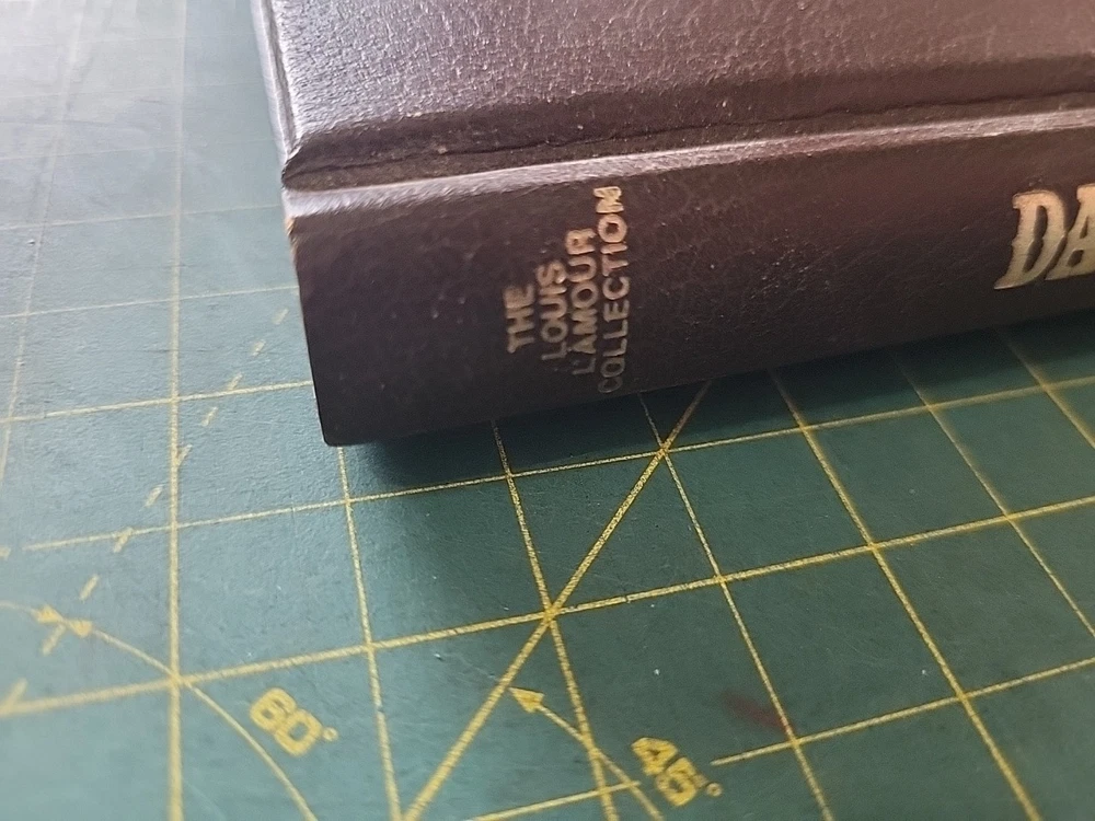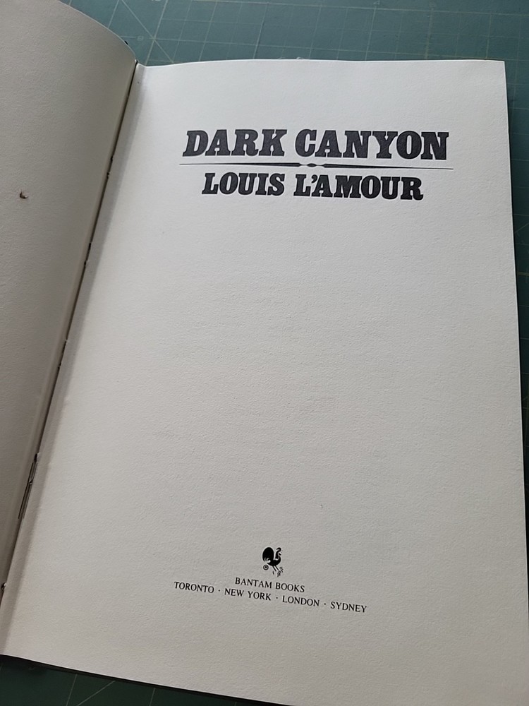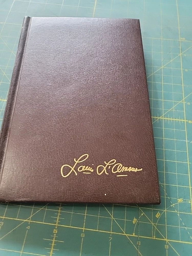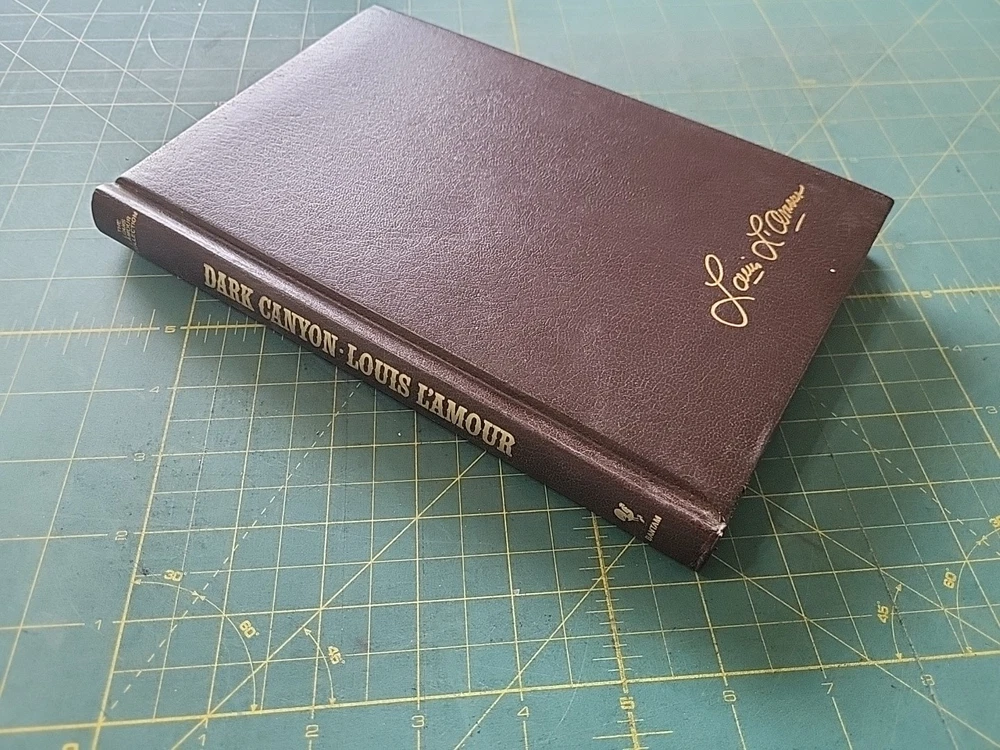 The product is a leatherette hardcover edition of the novel "Dark Canyon" by Louis L'Amour, part of "The Louis L'Amour Collection." Published by Bantam Books in 1985, this collector's edition features faux leather binding. The book is a work of fiction categorized under the Western genre, specifically focusing on the topic of Westerns. Written in English, the novel is part of a series by the renowned author and is a valuable addition to any Western literature collection.
