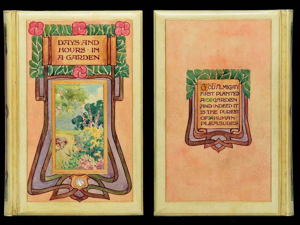 Days and Hours in a Garden by E.V.B. (Eleanor V. Boyle) Published by Elliot Stock, London, 1898 Signed “Vellucent” Binding by Cedric Chivers, Bath FINE Condition Binding Details: This is a beautiful example of a "vellucent" binding by Cedric Chivers who perfected the technique of using watercolors on transparent vellum. This intricate hand-painted binding features a classic design comprised of an elaborate cover treatment of gilt ruled borders with the front cover featuring a painting of a garden surrounded by purple framing and a mother-of-pearl inlay as well as the title highlighted in a scroll framed by leaves and flowers. The back cover continues the theme with gilt ruling and a watercolor painting containing a Francis Bacon’s comment on gardening that appears on the title page. The spine treatment is likewise decorated with the same motif. There are gilt ruled leather doublures and hand marbled endpapers with the top page ends being gold gilted. Stamped in gold gilt on the bottom of the inside back cover is the Cedric Chivers binder’s stamp. The book is housed in a functional cloth slipcase. About Chivers Vellucent Bindings: Around 1903, Cedric Chivers of Bath, England developed a remarkable method of decoration for the binding of books, the transparent vellum or “Vellucent” method. The process involved an artist painting on a super-thin surface medium, and a sheet of vellum, shaved to translucent thinness, was laid over it, with the now indivisible pieces bound over boards. For the first time in the history of the bibliopegistic art, the actual work of the artist, undiluted by a translation through the hands of a binding technician, was involved in the decoration of the book. Using the “vellucent method” it was also possible to incorporate further embellishments such as mother-of-pearl and iridescent shell, and the like, all of which may be covered and permanently protected by the vellum. As The Graphic Arts and Crafts Year Book for 1908 wrote, “It is difficult indeed not to become enthusiastic over the idea of the gorgeous aspect of a wealthy booklover’s library of “Vellucent”-bound books, which may become at the same time a cabinet of works of art, each one of his choice and rare volumes bearing an unique specimen of the book decorator’s skill, and embellished with the most varied and brilliant effects.” Book Details: Originally published in 1884, this is the 1898 edition of Days and Hours in a Garden by E.V.B. (Eleanor V. Boyle) published by Elliot Stock, London. Susan Krinsky in her essay from the Art of the Book wrote, “Eleanor Vere Boyle was a painter and illustrator whose arresting technique was influenced by the pre-Raphaelites. Her best works were simultaneously moody, immensely detailed, and haunting. This is clear in works such as her illustrations for Tennyson’s May Queen, which she illustrated for the poet in 1852 and Carove’s Story Without an End in 1868. It is particularly evident in her illustrations for Fairy Tales by Hans Andersen. This 1872 edition of Andersen is one of the earliest illustrated by an English person. It is certainly one of the most magnificent. She is one of the earliest woman artists to be recognized for her achievements, although she kept a low profile, and rarely exhibited her work publicly. Selling her paintings or illustrations was not considered acceptable, given her family’s social standing, and throughout her life she signed her works, “EVB,” obscuring her identity. EVB was an active artist and writer throughout her long life. In her later years, she primarily wrote and illustrated garden books with Days and Hours in a Garden being the most famous.” Measuring approximately 6.75” x 4.5” with 210 pages and an author’s preface, the book is illustrated with a frontispiece, several full page illustrations, and numerous in text illustrations. Condition Report: The binding is in FINE condition with very minimal surface wear. The binding is strong and secure. Internally, the book is generally clean with some mild foxing to the preliminaries as well as the page edges and some sporadic spotting throughout the text. Overall, this is a beautiful Chivers binding that houses one of the most popular works of a critically acclaimed Victorian illustrator. Photographs of the binding appear in the photo section of the listing.