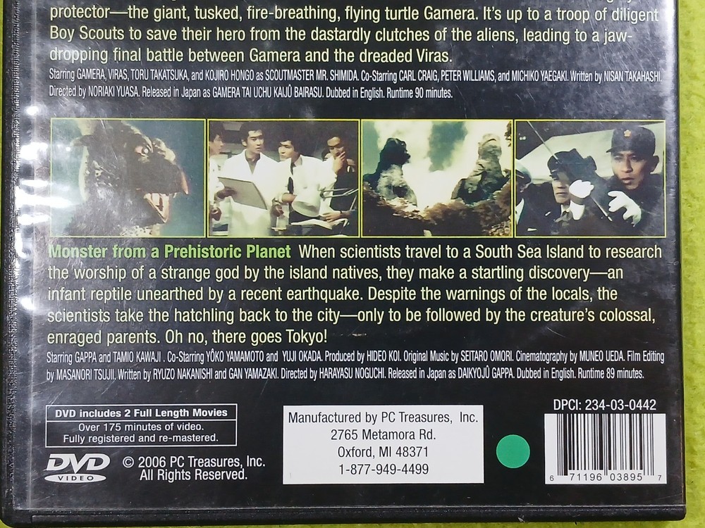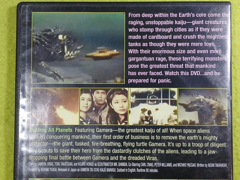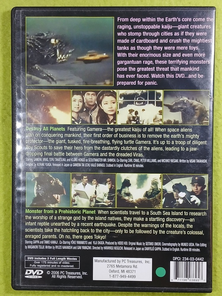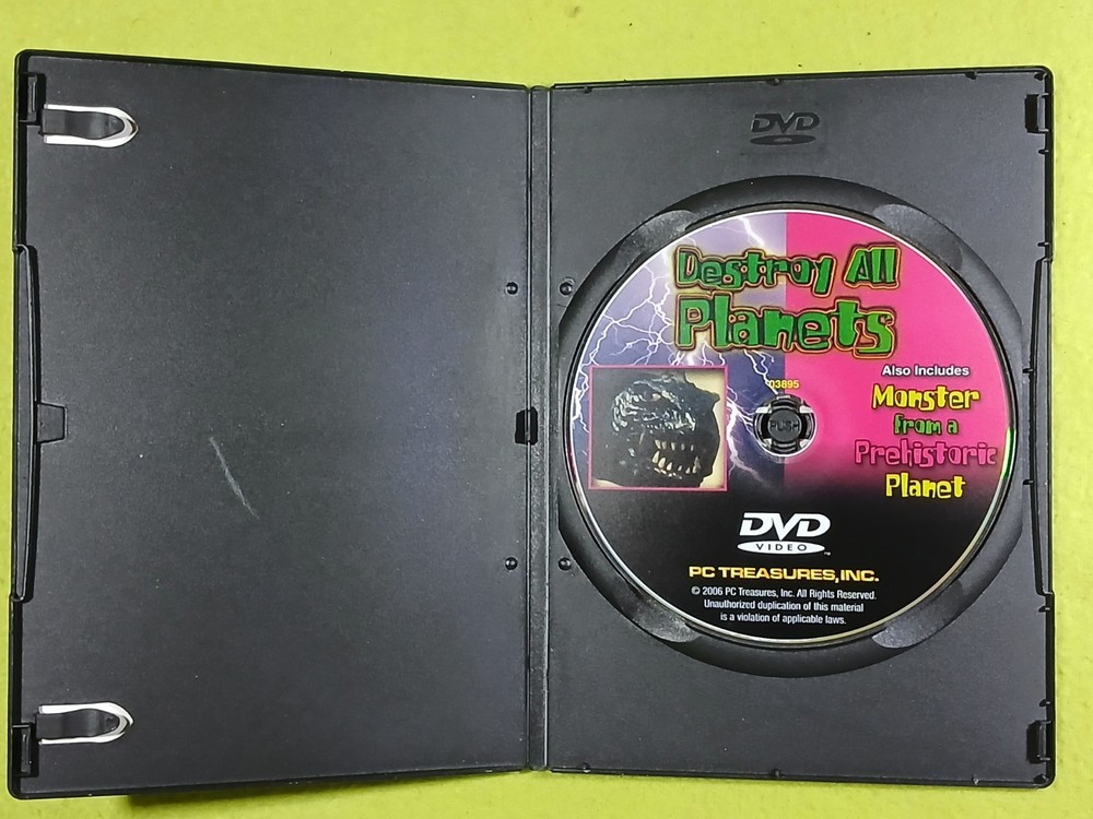 The "Destroy All Planets/Monster From A Prehistoric Planet" DVD is a double feature that includes two classic monster movies from the late 1960s, featuring iconic creatures like Gamera and Gappa. The DVD format is NTSC, with English subtitles and a 4:3 aspect ratio. This cult classic Godzilla franchise film is presented in a tall DVD case and is rated NR. With a mix of genres including action, sci-fi, horror, and fantasy, this release from PC Treasures is a must-have for fans of vintage monster movies. Condition is Very Good. Shipped with USPS Media Mail. OUT OF PRINT (OOP) AND HARD TO FIND (HTF)! SEE PHOTOS FOR CONDITION. Yes, these are photos of the actual item. What you see is what you are buying. Buy it now! Check my seller feedback and buy with confidence. I deal in quality goods and provide excellent customer service with fast shipping. I specialize in vintage, unusual, rare and out of print (OOP) media (Books, Magazines, Tapes, CD, DVD, VHS, Laserdisc) . I also sell lots of New Old Stock (NOS) collectibles. Be sure to check out my other items and add me to your favorite sellers. I list new items every week. No reserve price on auctions. If you bid, you can win! Buy it now or make your best offer! Want to purchase multiple items and combine shipping? Yes, I will work with you. Combined shipping is available for multiple items in the same category. Add to cart and request invoice for combined shipping. Flat rate shipping for most Media Mail items is $5.00 plus $1.75 for each additional item. Flat rate shipping for most vinyl records is $6.00 plus $2.00 for each additional record. **IF YOU DO NOT REQUEST AN INVOICE, I WILL NOT REFUND THE DIFFERENCE IN SHIPPING COST AS eBay COUNTS THAT AS AN ERROR BY THE SELLER AND IS A STRIKE AGAINST MY SELLER RATING. THE ONLY WAY TO GET COMBINED SHIPPING IS TO ADD TO CART AND REQUEST AN INVOICE.** Yes, I do ship internationally through eBay international shipping. I will not ship directly to international buyers, however I will ship internationally through eBay. If you receive a notification that I don't ship to your location, please, contact me. I have zero restrictions on international shipping. If eBay ships to your country, then, so do I. All additional charges for shipping, customs, and processing fees are handled by eBay. ATTENTION INTERNATIONAL BUYERS: If the shipping cost seems off, contact me with details. When listing items, I tend to stick with whatever eBay says the weight is and that's often not correct. If the weight is obviously overestimated, I will revise to the correct weight to help reduce your shipping cost. ALL ITEMS ARE SOLD "AS IS". NO WARRANTY. ALL SALES ARE FINAL. NO RETURNS. READ FULL DESCRIPTION AND EXAMINE THE PHOTOS TO BE CERTAIN THAT THIS IS THE ITEM YOU WANT TO BUY. ALL SALES ARE FINAL. NO RETURNS. IF YOU HAVE A QUESTION ABOUT THIS ITEM, ASK BEFORE BUYING. ALL SALES ARE FINAL. NO RETURNS. MY GUARANTEE: YOU WILL RECEIVE THE EXACT ITEM AS DEPICTED IN THE PHOTOS. ALL ITEMS SHIPPED PROMPTLY (WITHIN 2 BUSINESS DAYS OF PAYMENT CLEARANCE (MY LOCAL POST OFFICE IS NOT IN SERVICE ON SATURDAYS, SO I AM ONLY ABLE TO SHIP MONDAY THROUGH FRIDAY)) WITH TRACKING AND SAFE PACKAGING. ALL SALES ARE FINAL. NO RETURNS.