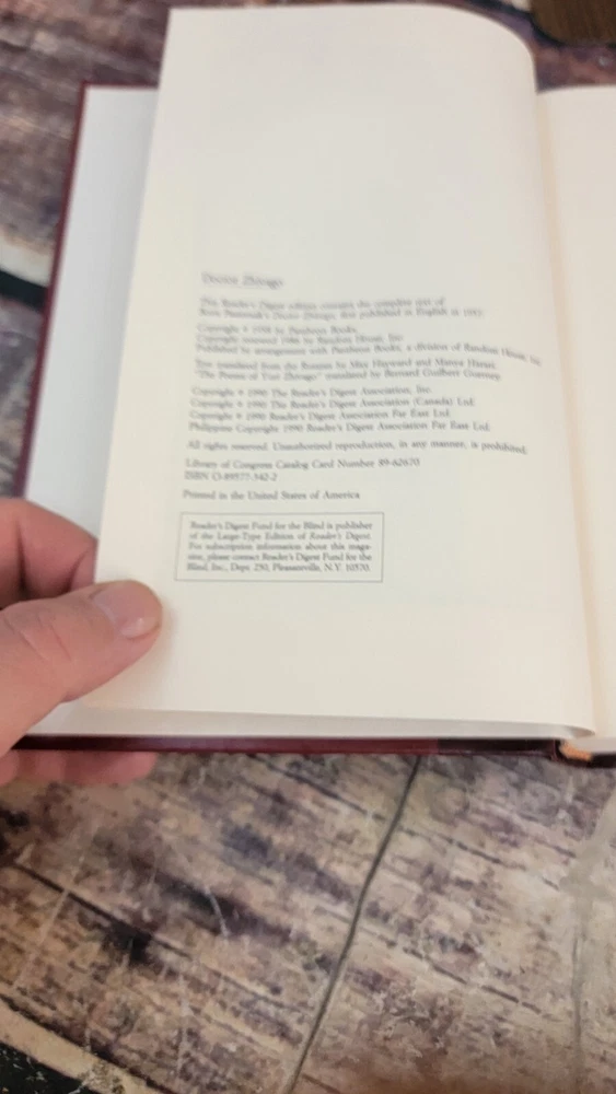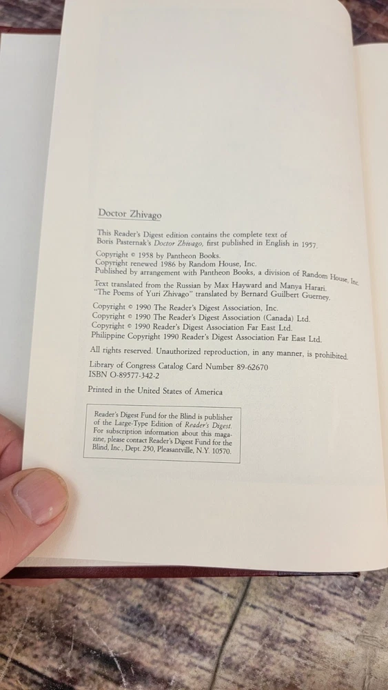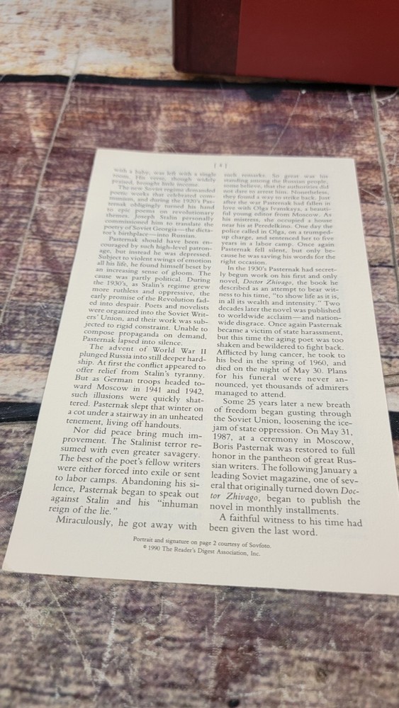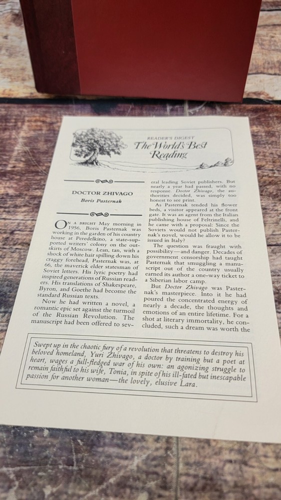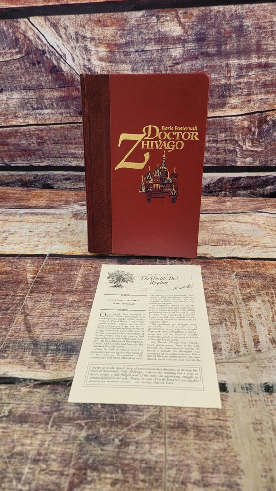 Doctor Zhivago Reader's Digest Leather Bound Book Boris Pasternak Classic Novel, with the four page leaflet describing it, in very good used condition, with only tiny flaws, as pictured. Please see the images of the actual item above for a better idea of the condition. The winner will pay postage and tracking, which is included in the shipping total. I am always happy to combine shipping whenever possible, please ask for a combined invoice after adding all items to your cart. Check out my other items! Please contact me with any issues prior to leaving negative/neutral Feedback or low detail ratings, as I will always do my best to solve any problems that may come up!