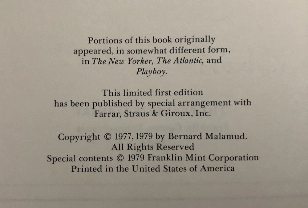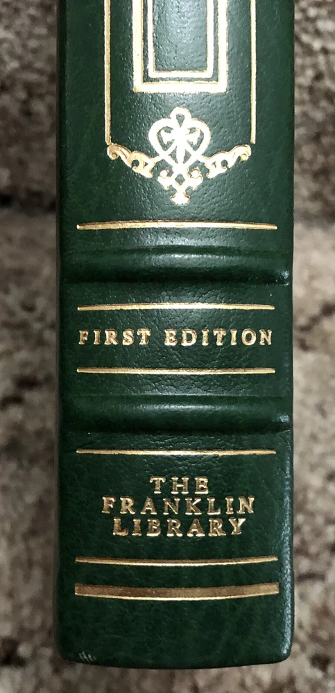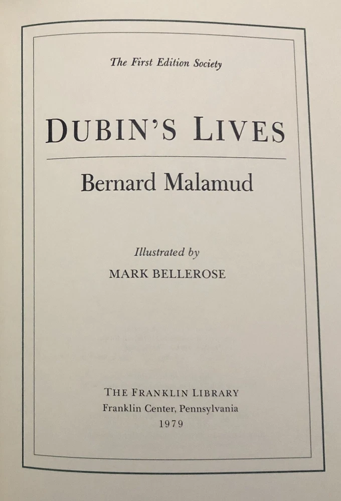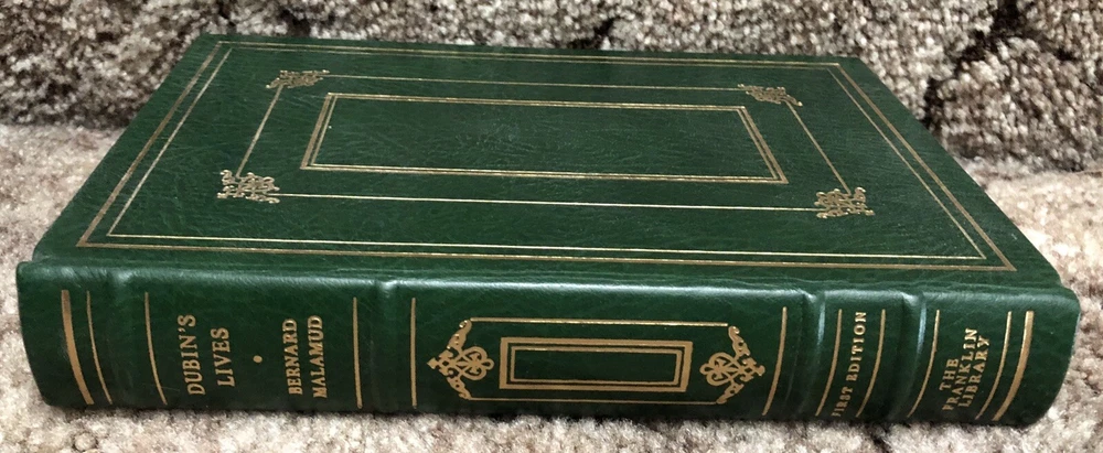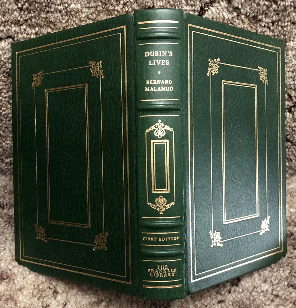 Dubin's Lives . By Bernard Malamud. © 1979. The First Edition Society. The Franklin Library. Handsome green leather bound cover with classic hubbed spine and gilt lettering and design. Lovely green moire fabric lining on inside covers and opposing end papers. Green ribbon book marker attachment. 449 pages. 9-3/8" x 6-1/2" x 1-1/2". Front end paper quotation: This limited first edition of Dubin's Lives by Bernard Malamud has been privately printed exclusively for Members of The First Edition Society. A portion of the proceeds from the sale of this listing will go towards an annual scholarship for a worthy student at Milton-Stateline Seventh-day Adventist School in Milton-Freewater, Oregon.