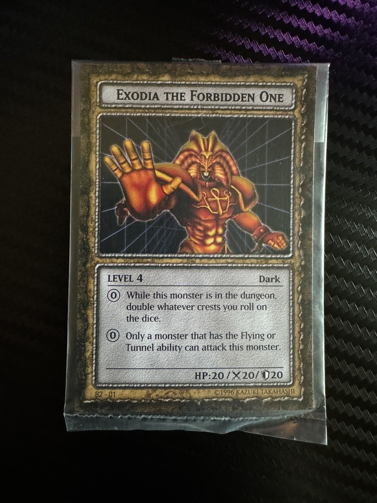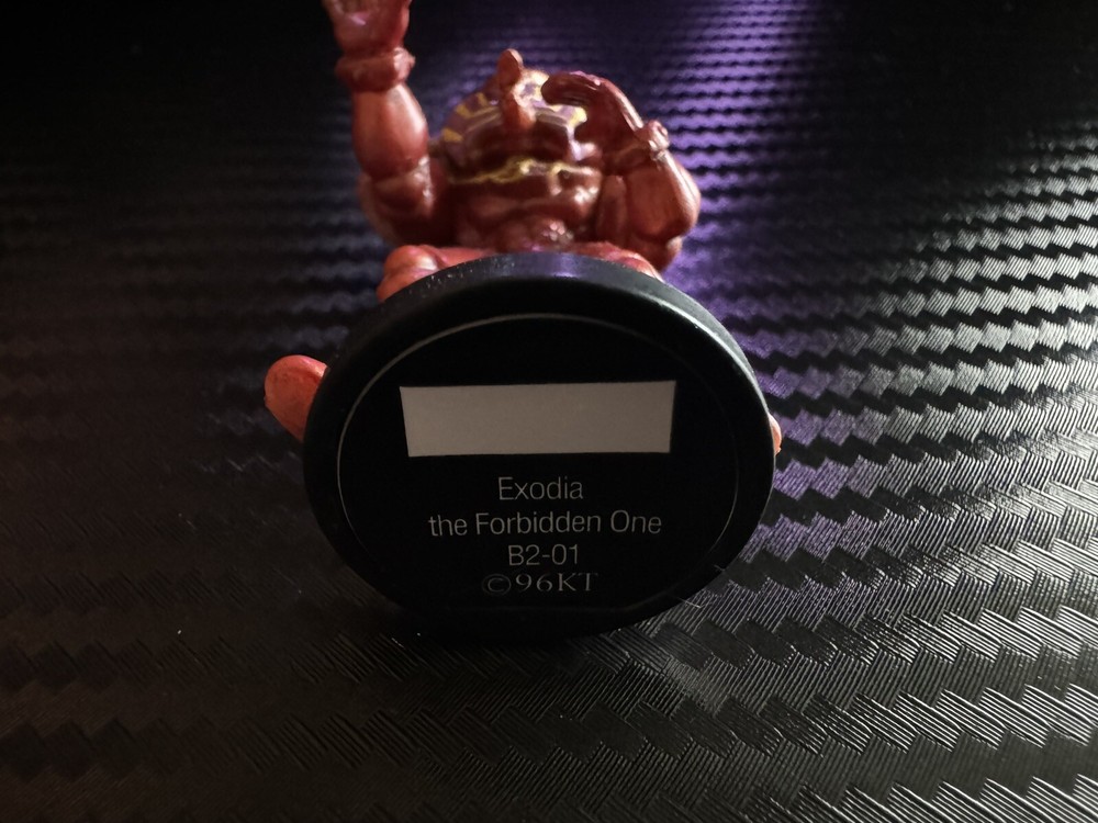 Yu-Gi-Oh Dungeon Dice Monsters Exodia The Forbidden One brand new unused figure with factory sealed card. Both in brand new condition. Has been stored away for about 20 years and was never used. Card has a very slight bow to it from age but can be easily corrected with a top loader. No dents, dings, creases, scratches or any damage whatsoever. Still in the plastic seal that it came in and has never been opened.