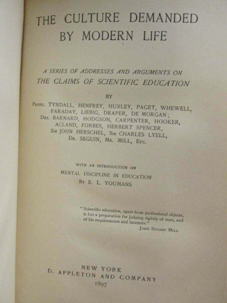 The Culture Demanded by Modern Life, a Series of Addresses and Arguments on the Claims of Scientific Education Author: E. L. Youmans Title: The Culture Demanded by Modern Life, a Series of Addresses and Arguments on the Claims of Scientific Education Publication: New York: D. Appleton and Co;, 1897 Description: Appleton series of "Authorized Edition" volumes. Published by D. Appleton & Co., New York, 1897. Measures 5.25" x 8", 473 pages. Half-bound in calf over marbled boards with top edge gilt. The book is in very good antiquarian condition. Minor wear to the leather spine with bumped corners. Slight scuffing to the board edges. There is a small number notation in ink on the front paste-down. The textblock is remarkably clean and bright with tight binding. Please view the many other rare titles available for sale at our store. We are always interested in purchasing individual or collections of fine books. Seller ID: 3799 Ernestoic Books Terms All orders ship within two business days. Standard mail is USPS Media Mail. Expedited and international shipping are also available. We offer combined shipping on multiple orders. All items are guaranteed to be as described or they may be returned within 30 days of receipt for a full refund. This listing was created by Bibliopolis.