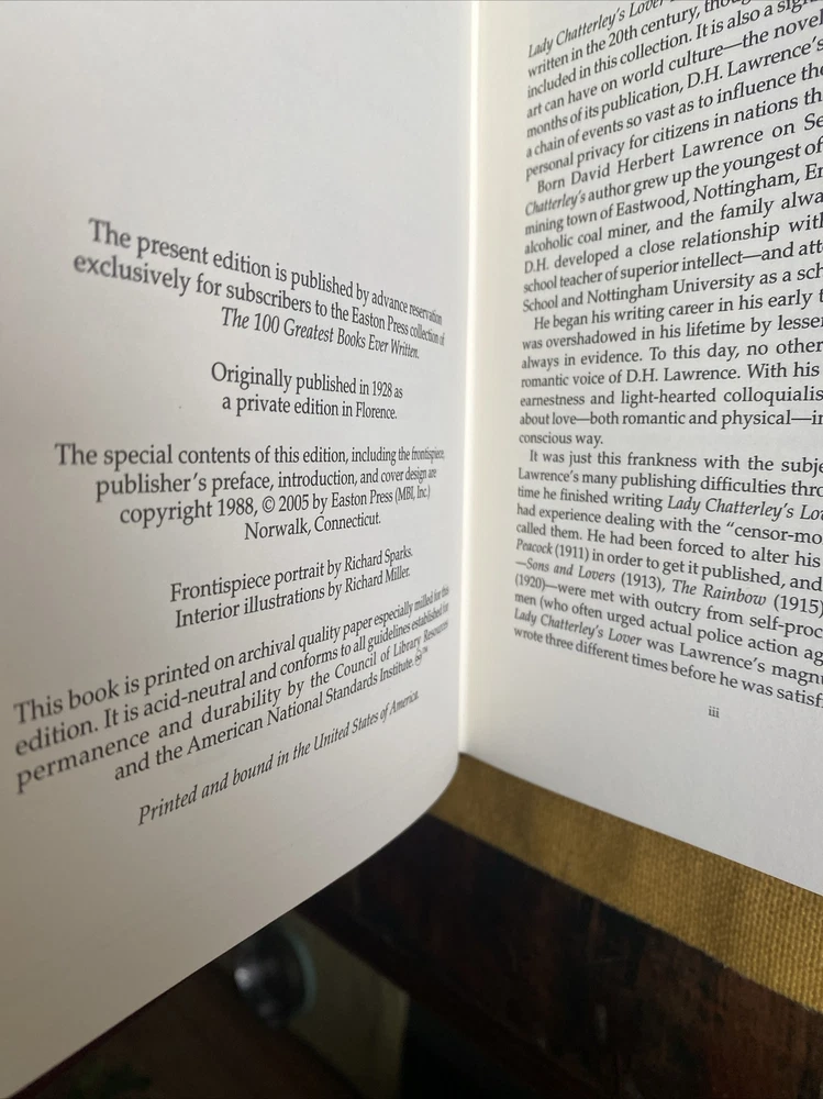 EASTON PRESS 100 Greatest Books~2005 Lady Chatterly's Lover D.H. Lawrence~Illus.. EXCELLENT - gilt great - two small hard to see shelf dings front cover bottom (pic) - 100 greatest series - please see...