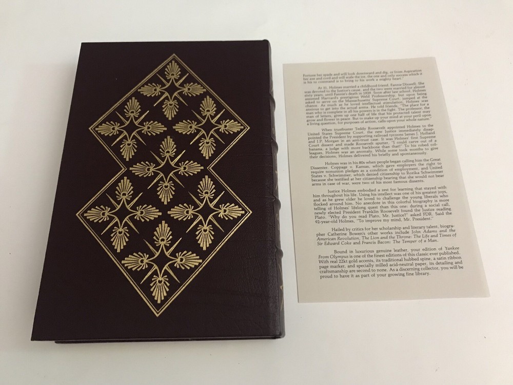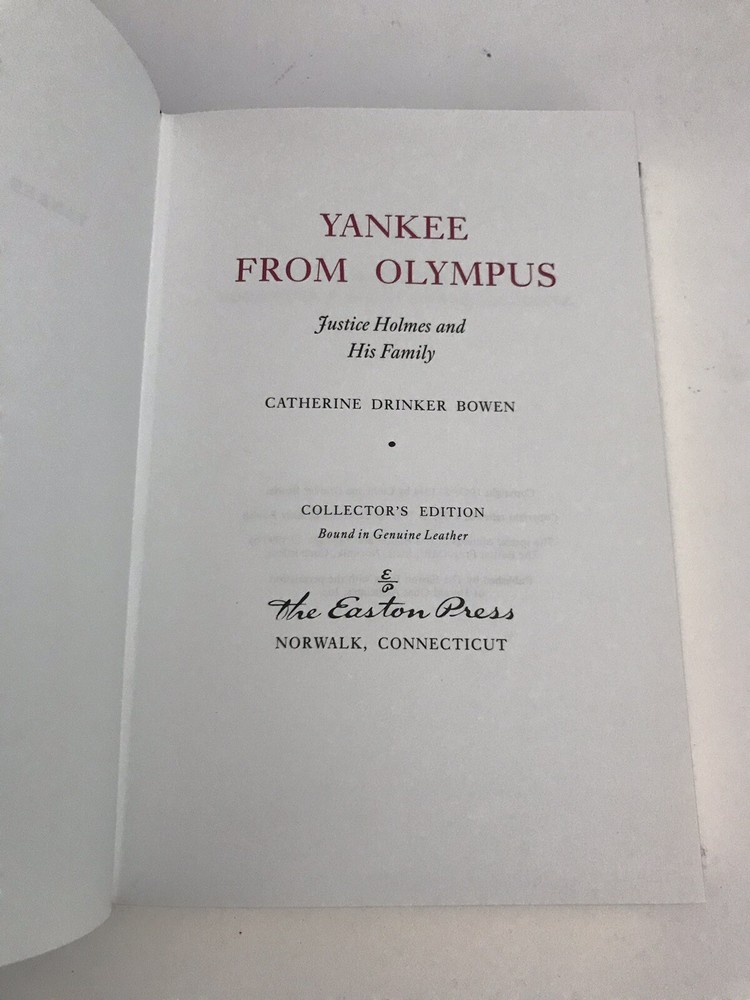Catherine Drinker Bowen: YANKEE FROM OLYMPUS JUSTICE HOLMES AND HIS FAMILY Easton Press Leatherbound Collector's Edition Leather-Bound Library of American History Easton Press books are bound in premium, hand-selected leather and have decorative accents stamped of 22kt. gold. They also feature hubbed spines, archival paper, and satin ribbon page markers. Book is in near fine condition (faint edgewear, faint wear to gilt on page edges , no writing inside, no highlighting, no attached bookplate, and no embossed seal). Includes sheet that describes the book issued by the Easton Press laid in.