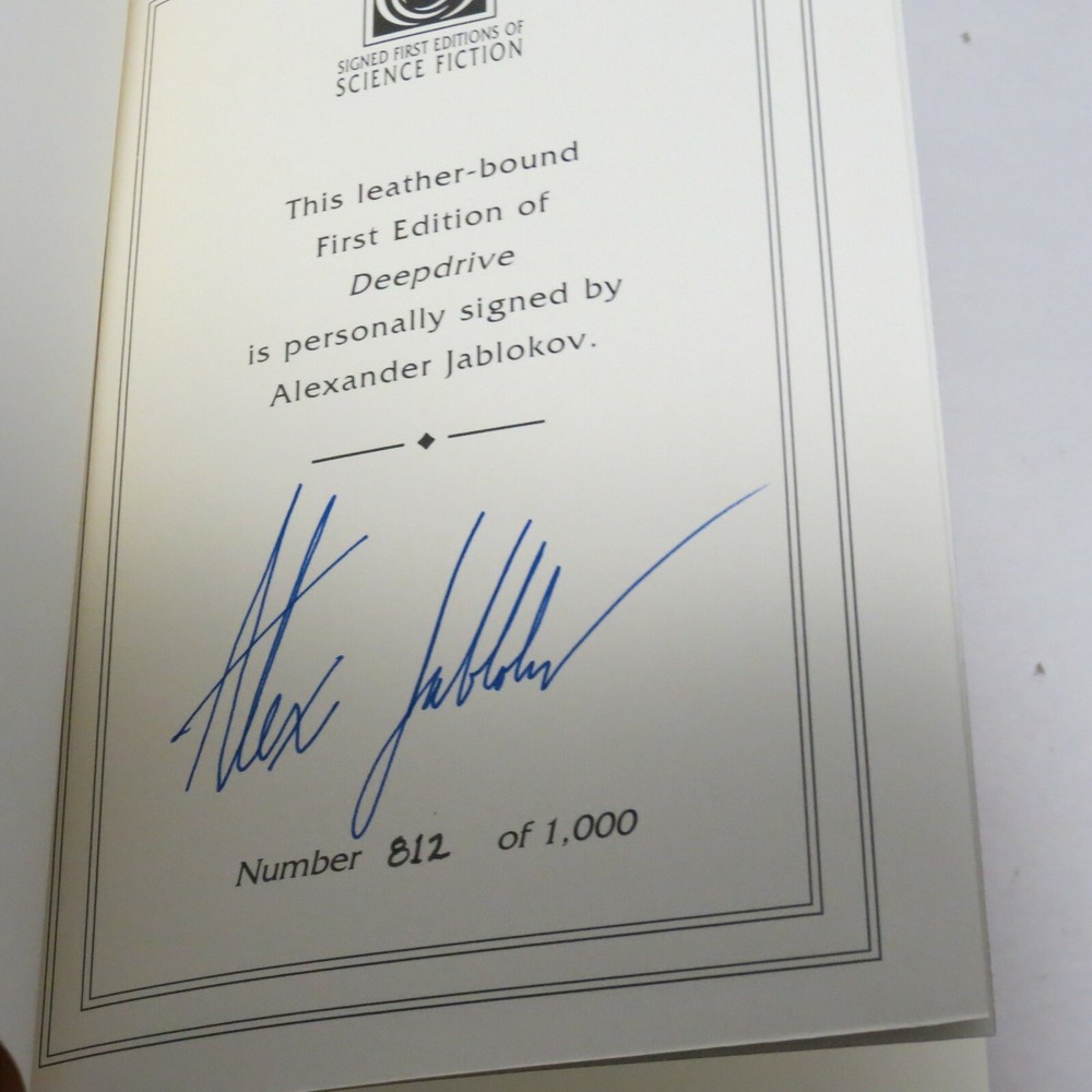EASTON PRESS DEEPDRIVE ALEXANDER JABLOKOB SIGNED FIRST EDITION W/COA UNREAD UNMARKED LEATHER. EXCELLENT CONDITION. SPINE IS TIGHT, PAGES CLEAN. NUMBERED, #812 OF 1,000. Book plate is affixed to front inside cover but is not signed, marked or embossed.