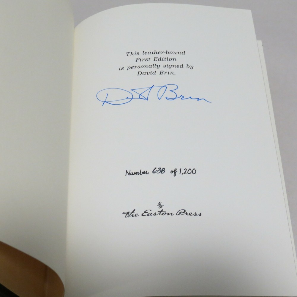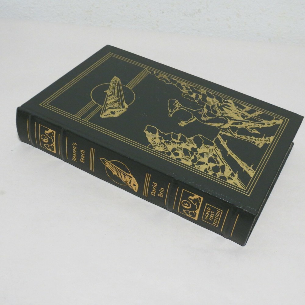 HEAVEN'S REACH DAVID BRIN SIGNED FIRST EDITION W/COA LIMITED UNREAD. Unread condition. Leather Bound. Edge Gilt. Does have some marks on the front. Not sure if there is something on the book or if the leather is worn. See pics. Spine is tight, pages clean. Has book plate attached but not signed or embossed. Number 638 of 1200.