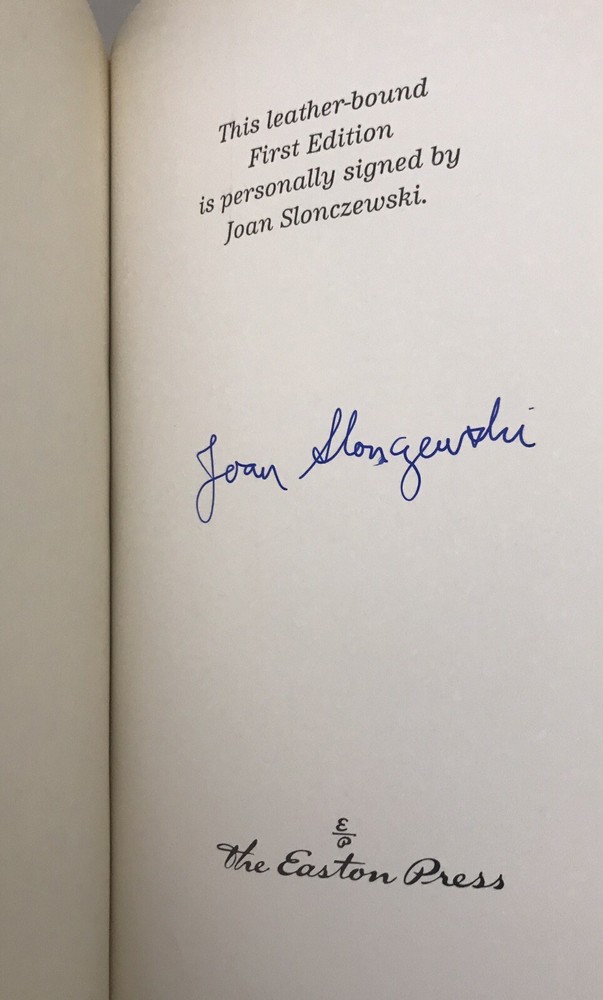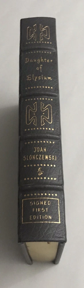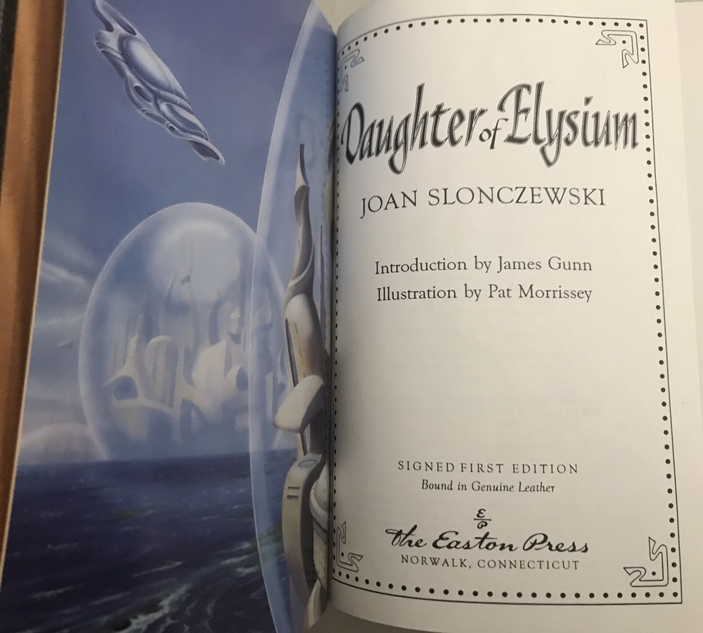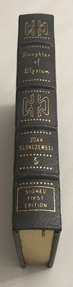 Joan Slonczewski DAUGHTER OF ELYSIUM Signed First Edition Easton Press leatherbound collector's edition features full leather binding, 22-kt gold stamping o tthe covers and spine, silk endpapers, a satin ribbon page marker, and all edges gilt. Book is in fine condition (faint wear to gilt on page edges, no writing inside other than author's signature, no highlighting, no creased pages, no attached bookplate, no embossed seal).