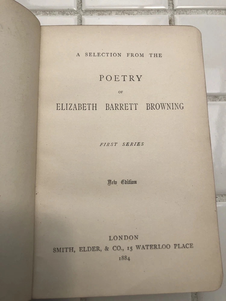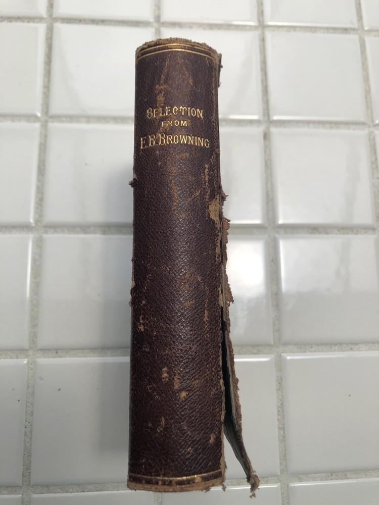 Up for sale is a nice EB Browning "A Selection From Elizabeth Barrett Brownings Poetry" 1884 First Series New Edition. The book is signed on the inside cover, not by her, in 1885 as a Valentines day gift! The front cover is ripped on the binding. The pages are still in good shape. Please look at the pictures and ask any questions you may have prior to purchase. Thank you.