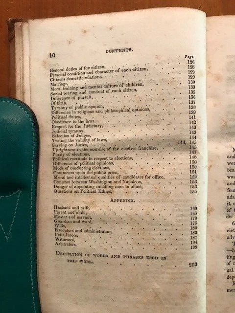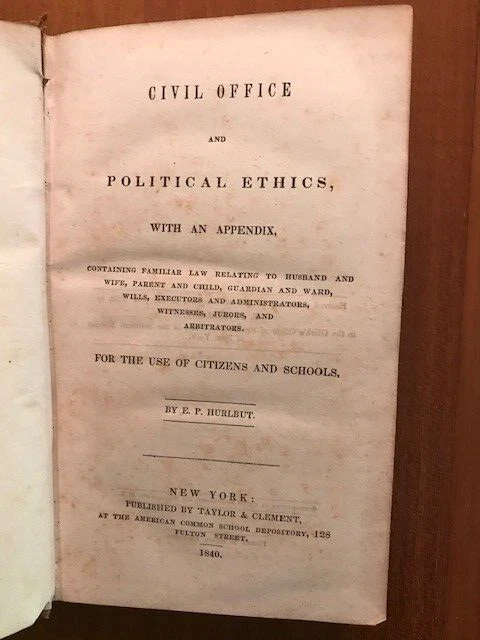 E.P. Hurlbut. Civil Office and Political Ethics, With an Appendix.... NY: Taylor & Clement, 1840. 1st edition. Hurlbut was a New York Supreme Court judge, a person of influence in New York in the mid-1800s, and a friend of Elizabeth Cady Stanton. This is a book on civics, with chapters on man in the state of nature, the formation and powers of the federal government, the various offices and powers of the state and towns of New York and political ethics. A very scarce title, with no copies found in the OCLC. Small 8vo. with a leather label on the spine. The leather-bound book is in better than good antiquarian condition.