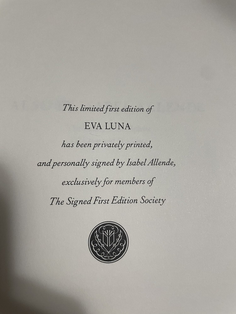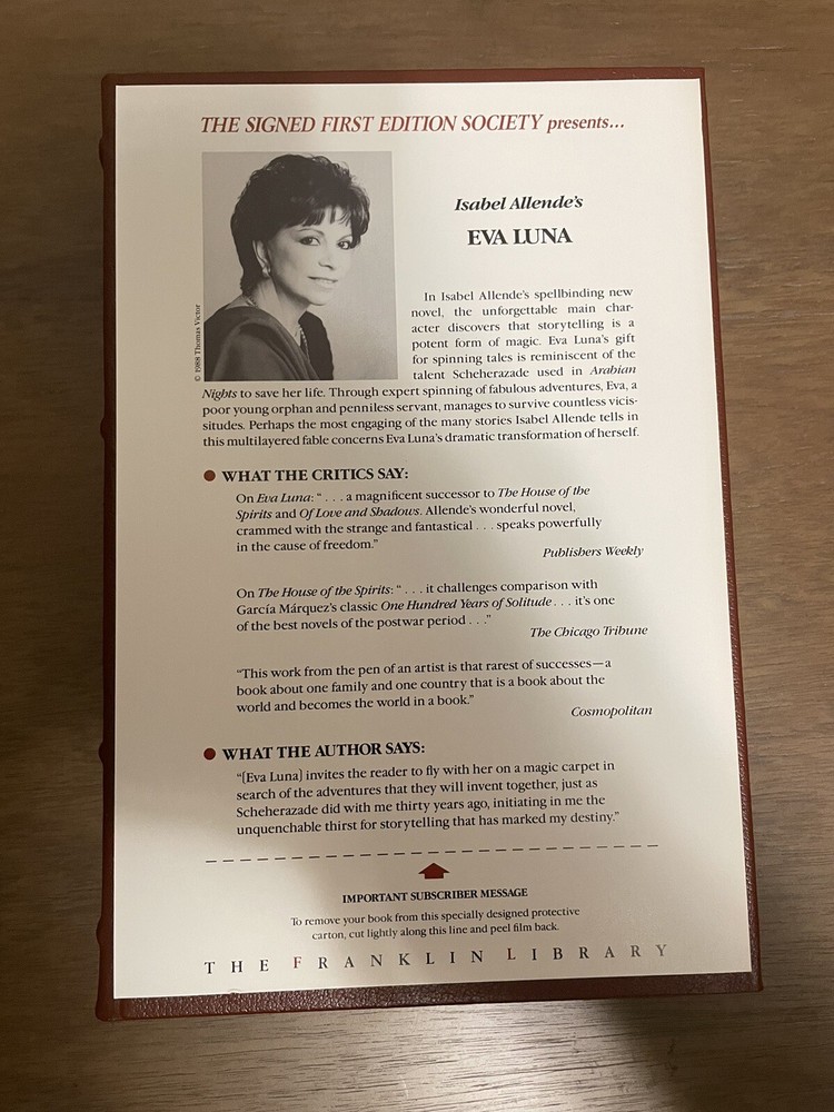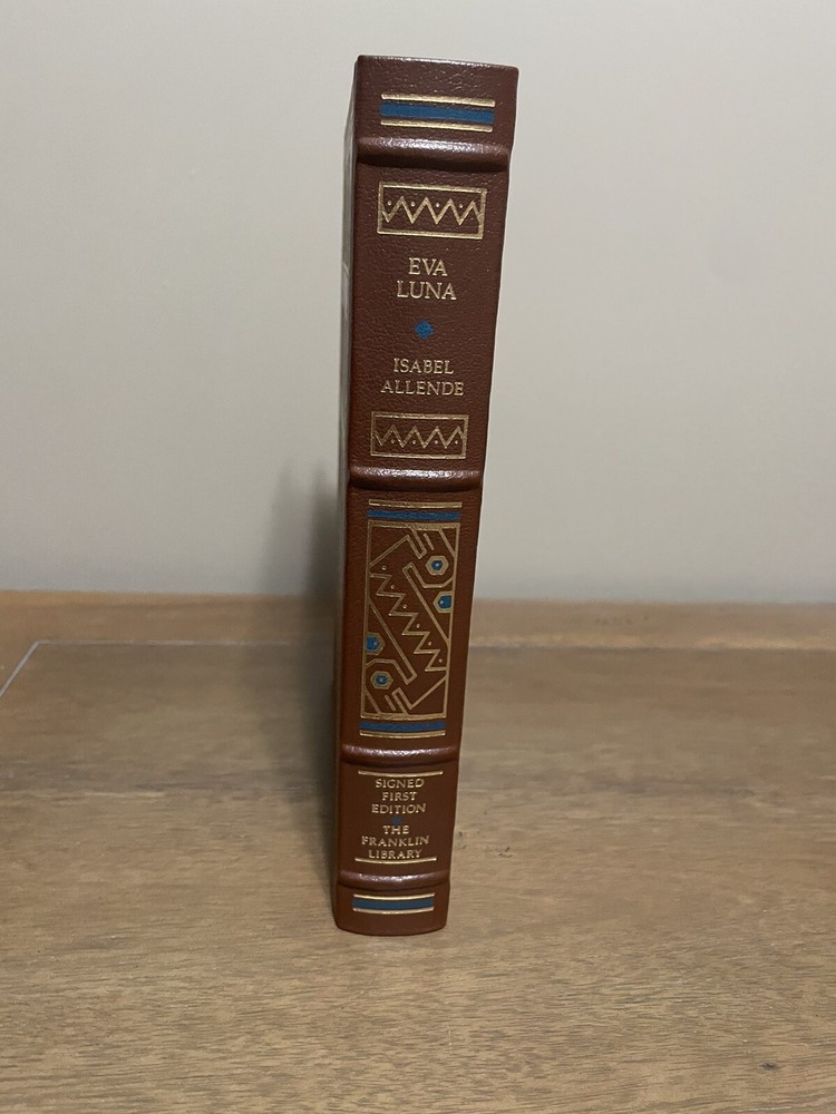 This exquisite edition of Isabel Allende's EVA LUNA is a collector's dream come true. A signed first edition bound in luxurious leather by the Franklin Library, this book is a beautiful addition to any collection. The book features special attributes such as gilt-edged pages, a satin bookmark, and intricate illustrations, making it a true work of art. The binding is made of high-quality leather, adding to the book's exceptional craftsmanship. This is truly a special item for any book lover or collector. Book is in good unread condition. See pictures.