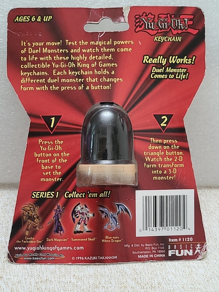 This Yu-Gi-Oh! keychain features the powerful EXODIA, the Forbidden One, along with other iconic characters like BLUE-EYES WHITE DRAGON and DARK MAGICIAN. The rotating figures add a fun element to this NEW 1996 collectible made of plastic. The keychain is perfect for fans of the franchise, and it can be a valuable addition to any anime and manga collection. This item is signed by No one and boasts a multicolor design. It falls under the categories of Collectibles, Animation Art & Merchandise, Animation Merchandise, and Other Animation Merchandise. Get your hands on this transforming capsule keychain and show off your love for YUGIOH.