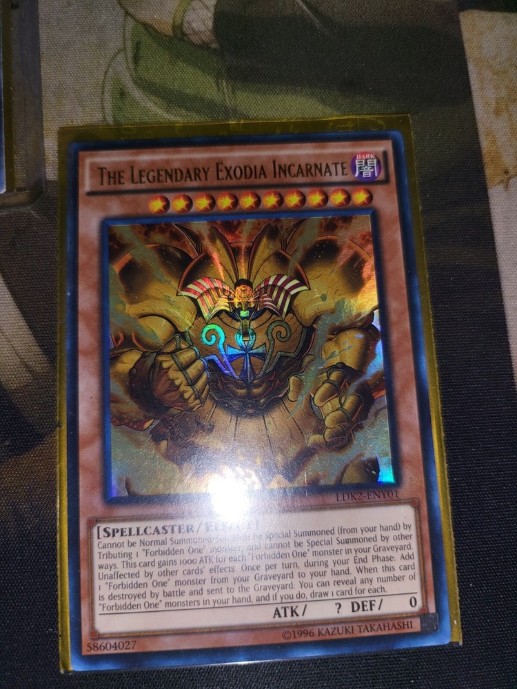 RARE *HOLO* AND* NON HOLO* DOUBLE EXODIA SET WITH BONUS CARD This rare and highly sought-after Exodia the Forbidden One card set is a must-have for any serious Yu-Gi-Oh! TCG collector. The set includes not only the YGLD but also the LDK2 Exodia cards, all of which are beautifully sleeved and made of high-quality plastic. With its double rare status, this Exodia set is a true gem that is sure to impress any fan of the game. So don't miss your chance to add this incredible card set to your collection today! BONUS CARD - THE LEGENDARY EXODIA INCARNATE MESSAGES ALWAYS OPEN JUST NEEDS A GOOD HOME TO A COLLECTOR HOLO WAS BOUGHT BY MOM AS A KID AND THE OTHER SET WAS PULLED A FEW YEARS BACK ON STREAM.