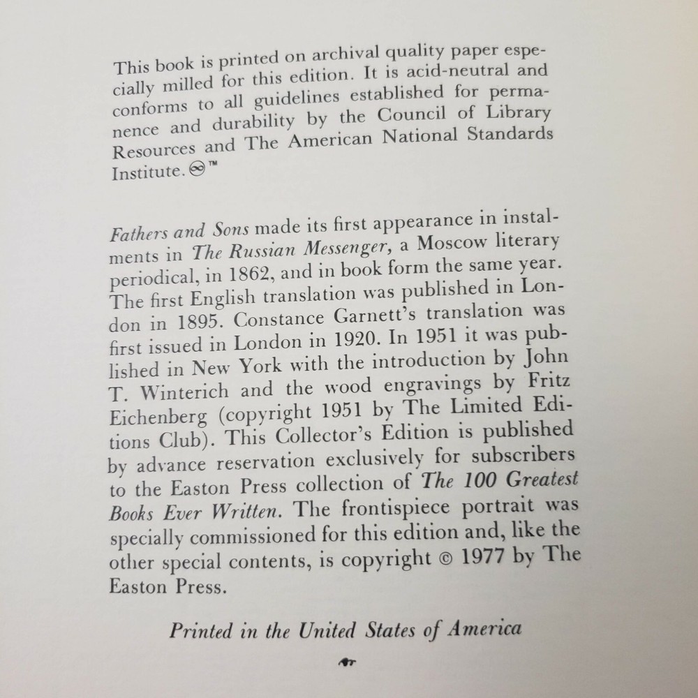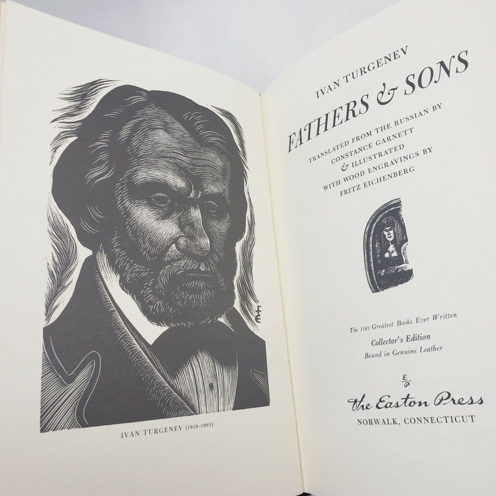 Fathers & Sons by Ivan Turgenev Easton Press Collector's Edition 1977 Leather Bound and Gilt Edged Pages Includes ribbon bookmark Excellent condition Appears unread Wood Engravings by Fritz Eichenberg Part of the 100 Greatest Books Ever Written Series