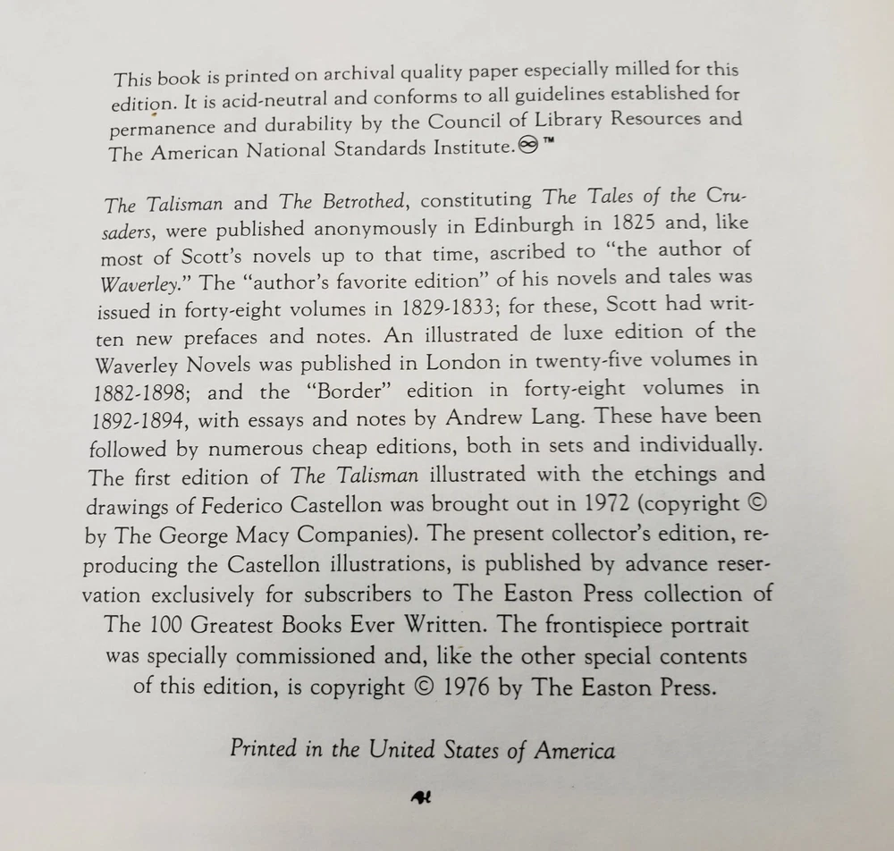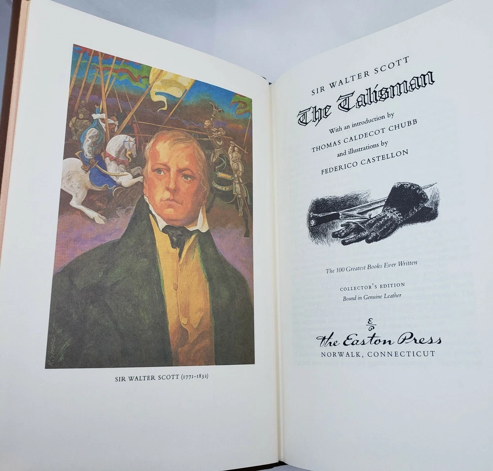 The Talisman by Sir Walter Scott Easton Press Collector's Edition 1976 Leather Bound and Gilt Edged Pages Includes ribbon bookmark Excellent condition Appears unread Illustrated by Federico Castellon Part of the 100 Greatest Books Ever Written Series