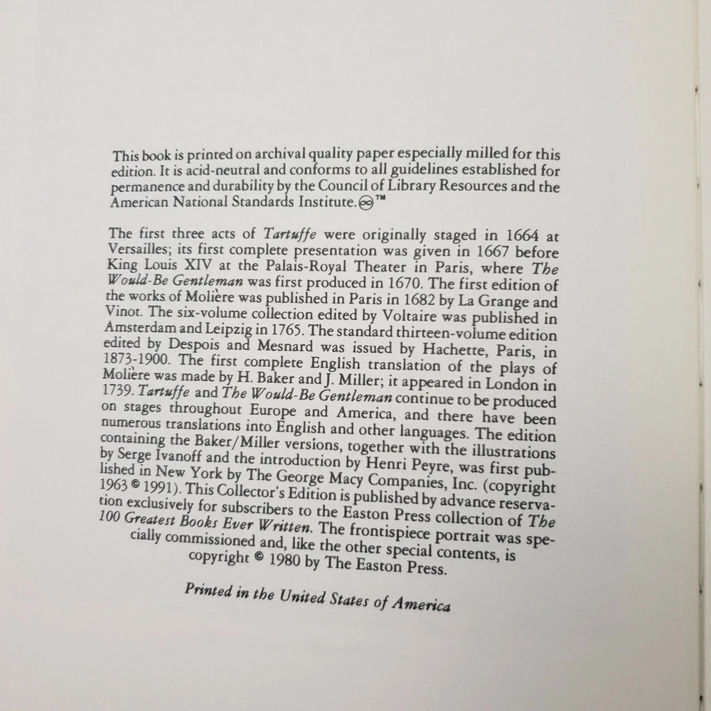 Two Plays - Tartuffe and The Would Be Gentleman - Moliere Easton Press Collector's Edition 1980 Leather Bound and Gilt Edged Pages Includes ribbon bookmark Very good condition Water mark on the fabric page and the one after it - see photos Appears unread Illustrated by Serge Ivanoff Part of the 100 Greatest Books Ever Written Series