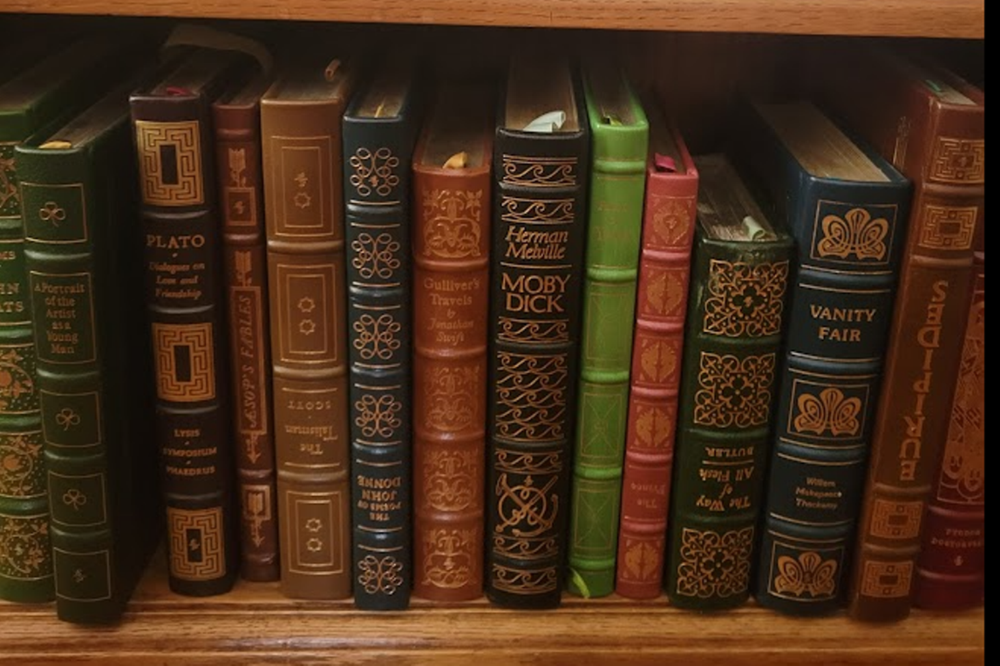 1. Pride and Prejudice 2. Uncle Tom’s Cabin 3. Anna Karenina 4. The Alhambra 5. The Decent of Man 6. The Iliad 7. Tom Jones 8. Tristram Shandy 9. Don Quixote 10. The Odyssey 11. Huckle Berry Finn 12. Brave New World 13. Poems of John Keats 14. Moby Dick 15. A Portrait of the Artist as a Young Man 16. Plato Dialogues on Love and Friendship 17. Aesop’s Fables 18. Fathers and Sons 19. Jane Eyre 20. The Republic 21. The Return of the Native 22. The Confessions of Jean-Jacques Rousseau 23. Leaves of Grass 24. Ivanhoe 25. The Red Badge of Courage 26. The Three Musketeers 27. Great Expectations 28. Madame Bovary 29. Chekhov’s Two Plays 30. The Autobiography of Benjamin Franklin 31. The Brothers Karamazov 32. Heart of Darkness 33. Euripides 34. David Copperfield 35. Livy History of Early Rome 36. Plato 37. Gulliver’s Travels 38. Vanity Fair 39. The Way of All Flesh 40. The Prince 41. Vanity Fair 42. The Talisman 43. The Poems of Jon Donne 44. The Origin of The Species