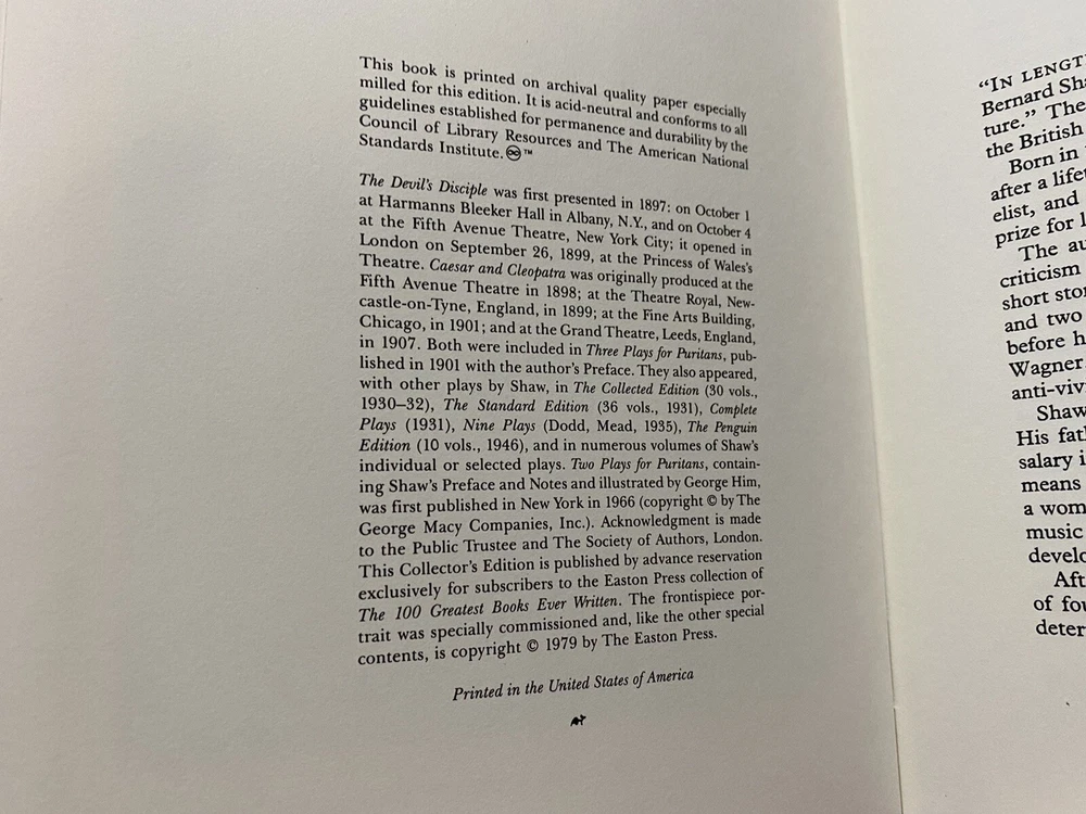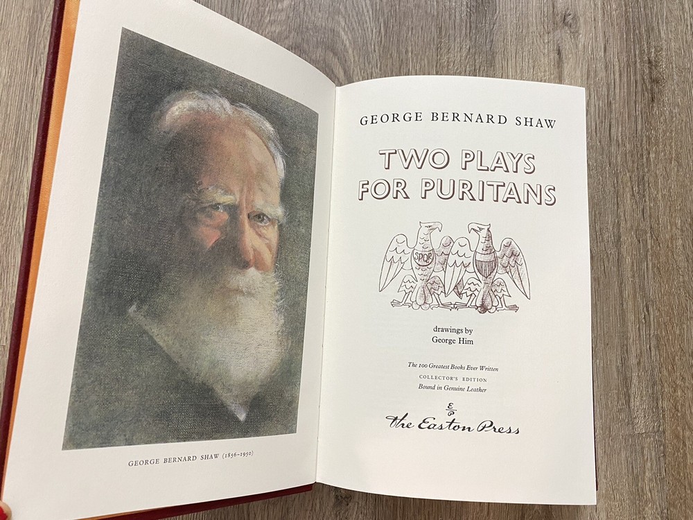 This auction is for an Easton Press 1979 Two Plays for Puritans by George Bernard Shaw Leather Bound Book. It is in very good preowned condition, please see photos....