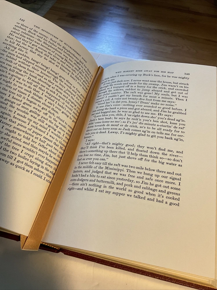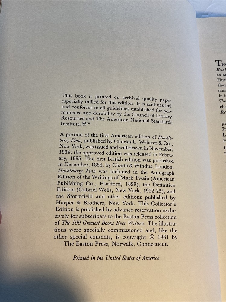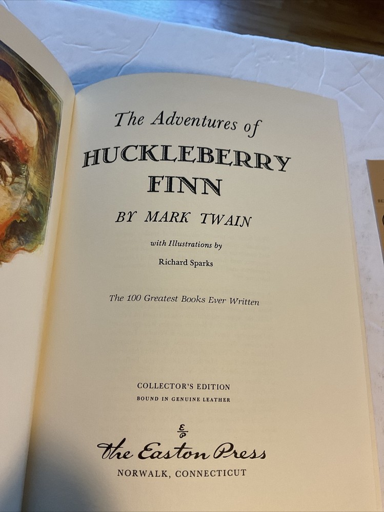 This is a beautifully bound edition of Mark Twain's Adventures of Huckleberry Finn, published by Easton Press in 1994. The leather binding and illustrated pages make it a true collector's item. The author's classic tale of adventure and self-discovery is sure to delight readers of all ages. This special edition is a must-have for any fan of literature, modern or otherwise. Condition: Like Brand New Review Photos for Condition and Details If their is a problem with your item, Please contact me first and we will solve the problem Grade for yourself see photos. Member of the Global Shipping Program. Please make payment within 3 days after winning Bid. Your item will be shipped within 1 business day after payment is paid If you like the item but not the price, please make a realistic offer. Check out my store for more great deals “ mikecw” Thanks