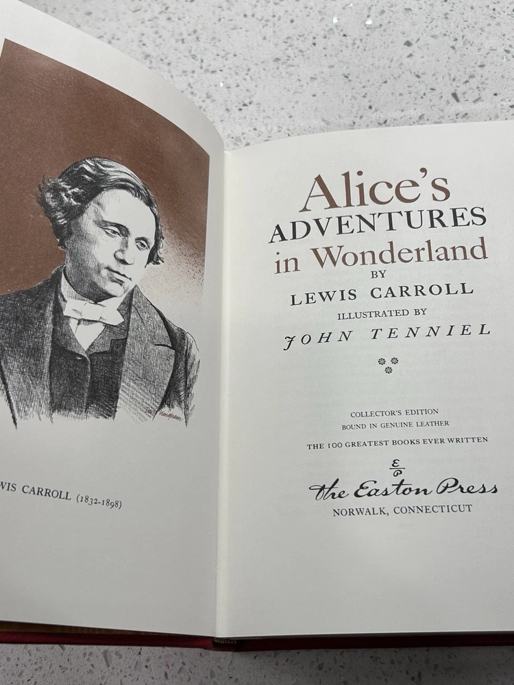 The product is a collector's edition of "Alice's Adventures in Wonderland" by Lewis Carroll, published by Easton Press in 1977. This leather-bound book is an original edition with illustrations by John Tenniel, making it a valuable addition to any literature and fiction collection. It is a special edition that showcases classic storytelling with a whimsical touch, perfect for fans of Alice in Wonderland and collectors of vintage literature. Made in the United States, this edition captures the essence of the beloved tale in a beautifully crafted format.