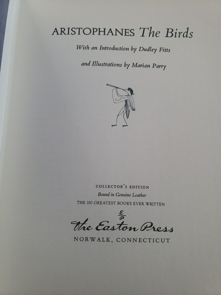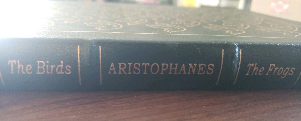 Clean and unmarked pages. Good solid binding, ships fast with care. The Easton Press Aristophanes - The Birds The Frogs 100 Greatest Series is a beautifully bound leather book that includes works by the famous playwright Aristophanes. Published by Easton Press in the United States, this collectible item is a must-have for any book enthusiast or collector. The book features two of Aristophanes' renowned plays, "The Birds" and "The Frogs," in English language, making it a valuable addition to any library focusing on classic literature.
