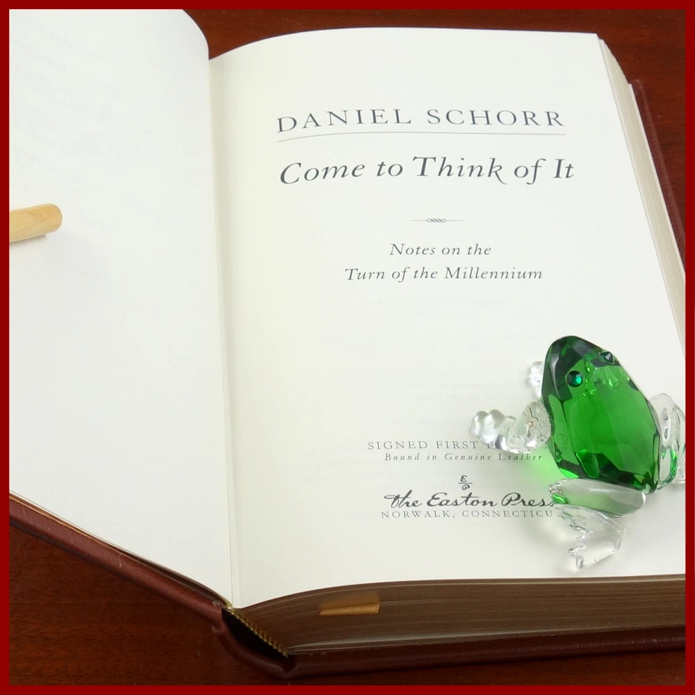This text is featured in the Easton Press series Signed First Edition . Published in 2007, bound in handsome Brown leather, and SIGNED by the author on the presentation page, this numbered edition, 522 of 1275, would be a worthy addendum to your collectibles library. Included is a Certificate of Authenticity and publisher insert. Specifics of this series from the Easton Press website: Fully and tightly bound in genuine leather. 22kt gold accents deeply inlaid on the "hubbed" spine. Heavy duty binding boards... . Superbly printed on acid-neutral paper... . Sewn pages – not just glued like ordinary books. ...moiré endpages and a satin-ribbon page marker. Gilded page ends. ******************************************************************************************************************* "Peerless commentary on recent politics and history from one of the preeminent reporters of our time, now with new material AN INSTITUTION at CBS for decades and a twenty-year mainstay of NPR, Daniel Schorr is a legend in journalism. Come to Think of It collects in one place, for the first time, Schorr's observations on politics and American life during the past two decades. His essays reveal his mastery of pithy, get-to-the-point analysis, and his experience gives him an authority and range that permeate every page. In these essays we get his on-the-spot reactions to the major and minor events around the turn of the millennium, from the shock of 9/11 to the mainstreaming of Yiddish. Come to Think of It is an unparalleled account of political analysis and personal memory." ///////////////////////////////////////////////////////////////////////////////////////////////////////////////////////////////////////////////////////// Daniel Schorr is currently a senior news analyst for NPR. He has won three Emmys, decorations from European heads of state, a Peabody award for “a lifetime of uncompromising reporting of the highest integrity,” awards from civil liberties groups, and the Alfred I. DuPont-Columbia University Golden Baton for “Exceptional Contributions to Radio and Television Reporting and Commentary,” the most prestigious award in broadcasting. After serving in World War II in Army intelligence, he wrote for the Christian Science Monitor and the New York Times before moving to CBS in 1953. He covered Khrushchev, Castro, the building of the Berlin Wall, then returned to Washington. His coverage of Watergate landed him on Nixon’s “enemies list.” He resigned from CBS in 1976 when asked to disclose the source of a suppressed intelligence report. In 1979 he helped Ted Turner creat CNN, and since 1985 has worked primarily for NPR. The above text was taken from Penguin publishing (via Google Books). [Schorr, Daniel. Come to Think of It: Commentaries from National Public Radio's Senior News Analyst. United States: Penguin Publishing Group, 2007. ]