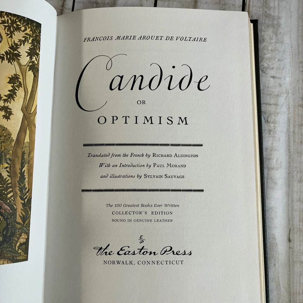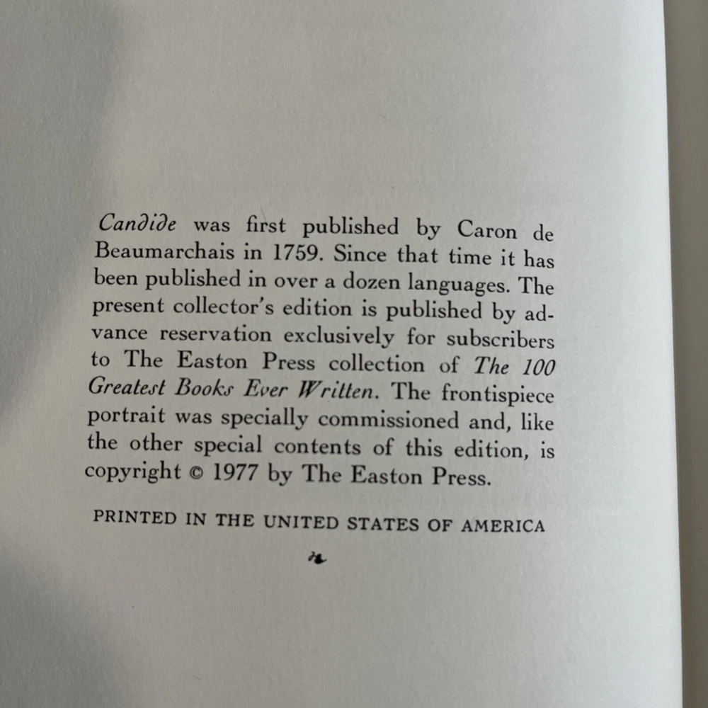 Dive into the satirical genius of François Marie Arouet de Voltaire with the Easton Press edition of "Candide," aptly subtitled "Optimism." Published in 1977, this leather-bound collector's item is a testament to classic literature and a must-have for enthusiasts of fiction that pierces the veil of superficial happiness. Crafted in the United States, this original edition captures the essence of Voltaire's provocative narrative in elegant English. A proud addition to any library, it’s a seamless blend of historical significance and aesthetic pleasure, offered without signatures or personalization, preserving the author's pure voice.