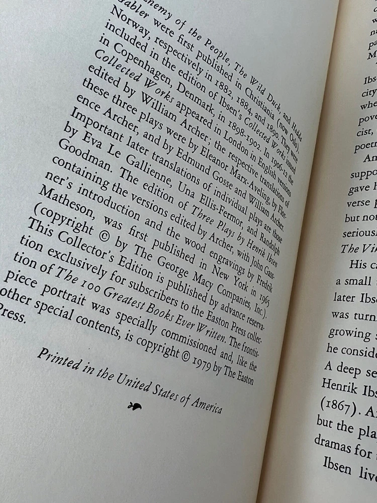 Easton Press Collector’s Edition Three Plays by Henrik Ibsen 1979 Leather Book! Has some marking and slight scratches on gold gilt. View images for details, comes as shown....