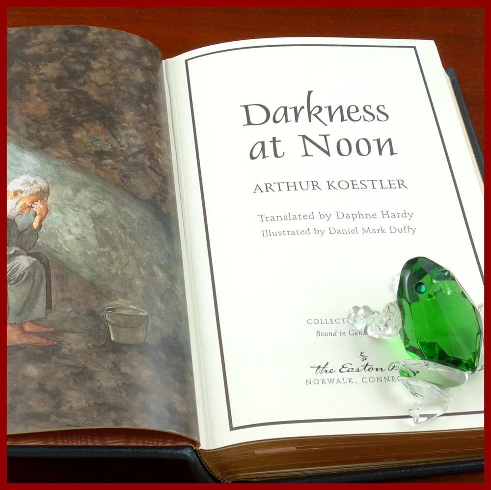 We recently purchased a large collection of Easton Press books to be listed in the coming weeks. Stay tuned for the chance to pick up some collectible titles. This text was featured in the Easton Press series Great Books of the 20th Century . Published in 2000, bound in handsome Grey leather, and strikingly illustrated by Daniel Mark Duffy, this edition would be a worthy addendum to your collectible books library. Specifics of this series from the Easton Press website: Fully and tightly bound in genuine leather 22kt gold accents deeply inlaid on the "hubbed" spine.* Heavy duty binding boards... . Superbly printed on acid-neutral paper... . Sewn pages – not just glued like ordinary books. ...moiré endpages and a satin-ribbon page marker. Gilded page ends. ******************************************************************************************************************* ". . . Set in the 1930s at the height of the purge and show trials of a Stalinist Moscow, Darkness at Noon is a haunting portrait of an aging revolutionary, Nicholas Rubashov, who is imprisoned, tortured, and forced through a series of hearings by the Party to which he has dedicated his life. As the pressure to confess preposterous crimes increases, he re-lives a career that embodies the terrible ironies and betrayals of a merciless totalitarian movement masking itself as an instrument of deliverance. Koestler’s portrayal of Stalin-era totalitarianism and fascism is as chilling and resonant today as it was in the 1940s and during the Cold War. Rubashov’s plight explores the meaning and value of moral choices, the attractions and dangers of idealism, and the corrosiveness of political corruption. Like The Trial, 1984, and Animal Farm, this is a book you should read as a citizen of the world, wherever you are and wherever you come from." ///////////////////////////////////////////////////////////////////////////////////////////////////////////////////////////////////////////////////////// Arthur Koestler CBE (5 September 1905 – 1 March 1983) was a Hungarian-born author and journalist. Koestler was born in Budapest and, apart from his early school years, was educated in Austria. In 1931, Koestler joined the Communist Party of Germany, but he resigned in 1938 after becoming disillusioned with Stalinism. Having moved to Britain in 1940, he published his novel Darkness at Noon , an anti-totalitarian work that gained him international fame. Over the next 43 years, Koestler espoused many political causes and wrote novels, memoirs, biographies, and numerous essays. In 1949, Koestler began secretly working with a British Cold War anti-communist propaganda department known as the Information Research Department (IRD), which would republish and distribute many of his works, and also fund his activities. In 1968, he was awarded the Sonning Prize "for [his] outstanding contribution to European culture". In 1972, he was made a Commander of the Order of the British Empire (CBE). In 1976, he was diagnosed with Parkinson's disease and in 1979 with terminal leukaemia. On 1 March 1983, Koestler and his wife Cynthia committed suicide together at their London home by swallowing lethal quantities of barbiturate-based Tuinal capsules. The above text was taken from, respectively, Scribner publishing (via Google Books) and Wikipedia. [Koestler, Arthur., Scammell, Michael. Darkness at Noon: A Novel. United States: Scribner, 2019. ]