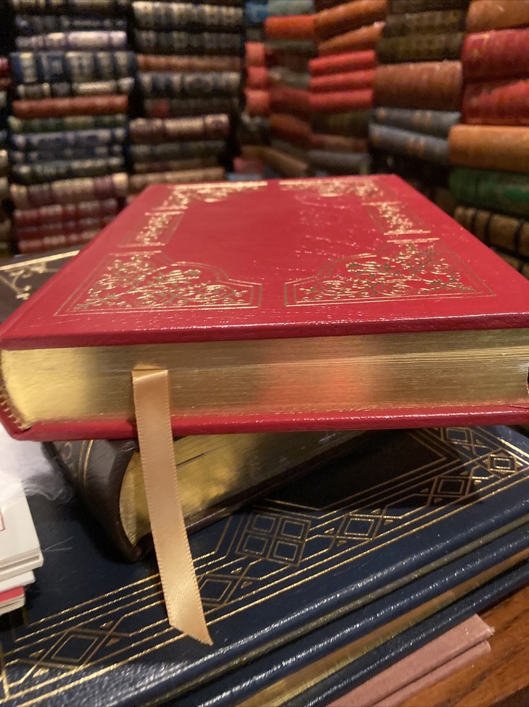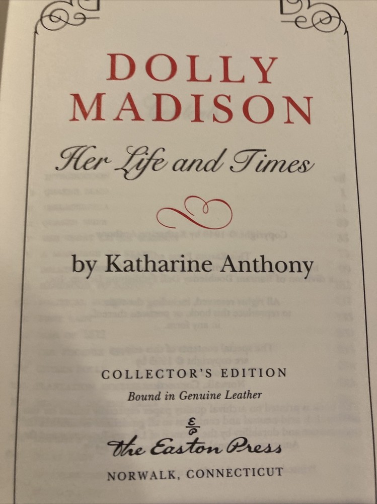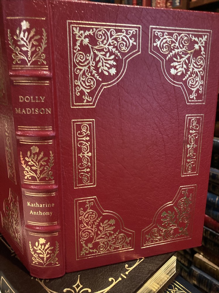Easton Press leather edition of Katherine Anthony's "Dolly Madison: Her Life and Times," a COLLECTOR'S edition, one of the LIBRARY OF AMERICAN HISTORY series, published in 1995. Bound in burgundy leather, the book has decorative paper end leaves, satin book marker, acid-free paper, hubbed spine, gold gilt on three edges---in FINE condition. COLLECTOR'S NOTES is included. Dolly Madison, who lived from 1768-1849, was born into a Quaker family in Pennsylvania. She first married John Todd, who died during a yellow fever epidemic in 1793, leaving her with two small children. One son survived, who grew up to be a charming yet worthless scoundrel, who caused his mother lifelong heartbreak. Dolly married "the great little Madison" when she was 26 and he was 40. Despite their disparity in age and appearance---she was very "spiffy" and he was plain, standing 5'6" tall---they seemingly enjoyed a very loving marriage. Dolly was noted for her beautiful clothes and especially her turbans. As acting White House hostess for the widowed THOMAS JEFFERSON, and wife of JAMES MADISON, she held the position of FIRST LADY for 16 years. Furthermore, during her long life, she knew all the Presidents from Washington to Zachary Taylor. She also lived through two wars---the Revolution and the War of 1812. While her husband was President, the British burned the "President's house," and Dolly saved the large portrait of GEORGE WASHINGTON and a few other historical pieces of furniture. When her husband completed his two terms as President, the couple retired to Montpellier, Madison's Virginia estate where they entertained and lived peacefully with their "adoring slaves." Although he adamantly opposed slavery, when General Lafayette visited the U.S. and came to spend a week at Montpellier, he was amazed that the Madison slaves were very contented and absolutely adored Dolly and James. Although the last chapters of Dolly Madison's life are filled with much sadness----her drunken wayward son continued to "drain her financially" and disappoint her with his reckless lifestyle---she retained her characteristic cheerfulness. After her husband's death she managed "to keep the wolf" from the doors by selling the family estate and her late husband's meticulously organized papers. She eventually left Montpellier and returned to Washington, D.C. where she died---almost penniless! 426 pages, including an index---a RARE title. I offer combined shipping