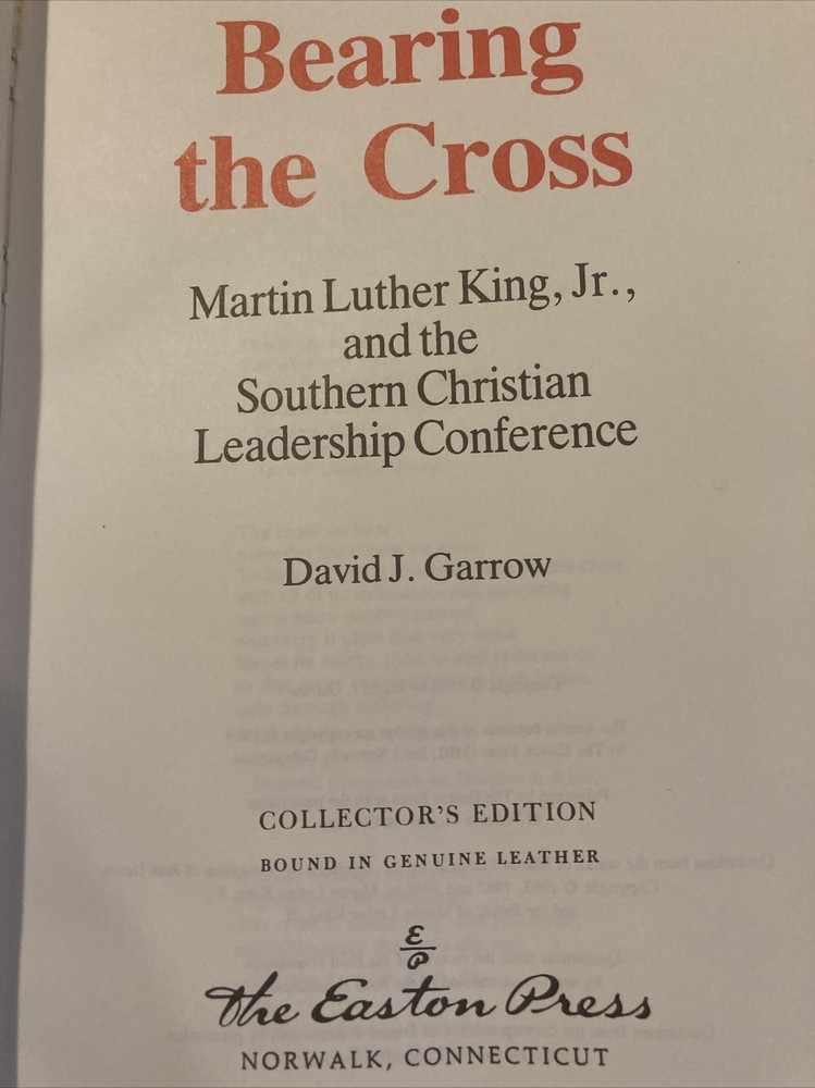 Easton Press leather edition of David J. Garrow's "Bearing the Cross: Martin Luther King, Jr., and the Southern Christian Leadership Conference," a COLLECTOR'S edition, one of the LIBRARY OF AMERICAN HISTORY series, published in 1989. Bound in red leather, the book has decorative paper end leaves, satin book marker, hubbed spine, acid-free paper, gold gilt on three edges---in near Fine condition. Martin Luther King. Jr., who lived from 1929 – 1968, was a Baptist minister and activist who became the most visible spokesperson and leader in the American civil rights movement from 1955 until his assassination in 1968. His charismatic leadership made King a "chosen son," and his strategy of coupling Christian love with nonviolent protest won many advocates. King advanced civil rights through nonviolence and civil disobedience, inspired by his Christian beliefs and the nonviolent activism of MAHATMA GANDHI. He was the son of early civil rights activist MLK, Sr. King participated in and led marches for blacks' right to vote, desegregation, and labor rights. He led the 1955 Montgomery bus boycott and later became the first president of the Southern Christian Leadership Conference (SCLC). As president of the SCLC, he led the unsuccessful nonviolent 1963 protests in Birmingham, Alabama and helped organize the 1963 March on Washington , where he delivered his famous "I Have a Dream " speech on the steps of the Lincoln Memorial. There were several dramatic stand-offs with segregationist authorities, who sometimes turned violent. FBI Director J. EDGAR HOOVER considered King a radical and ordered FBI agents to investigate him for possible communist ties, recorded his numerous extra martial sexual affairs and reported on them to government officials, and, in 1964, mailed King a threatening anonymous letter , which he interpreted as an attempt to make him commit suicide. On October 14, 1964, King won the NOBEL PEACE PRIZE for combating racial inequality through nonviolent resistance. In 1965, he helped organize the SELMA to MONTGOMERY marches. In his final years, he expanded his focus to include opposition towards poverty, capitalism, and the Vietnam War. In 1968, King was planning a national occupation of Washington, D.C., to be called the Poor People's Campaign, when he was assassinated on April 4 in Memphis, Tennessee. His death was followed by riots in many U.S. cities. Allegations that JAMES EARL RAY, the man convicted of killing King, had been framed or acted in concert with government agents persisted for decades after the shooting. Martin Luther King Jr. Day was established as a holiday in cities and states throughout the United States beginning in 1971; the holiday was enacted at the federal level by legislation signed by President Ronald Reagan in 1986. Hundreds of streets in the U.S. have been renamed in his honor and the MLK, Jr. Memorial on the National Mall in Washington, D.C., was dedicated in 2011. Garrow's book includes over 700 interviews with such key leaders as JESSE JACKSON, ANDREW YOUNG, RALPH ABERNATHY, and his wife, CORETTA SCOTT KING; scores of pertinent manuscripts, and printed sources, plus the files of 191 newspapers and periodicals. Garrow was able to gain access to secret FBI and CIA files on King. Garrow wrote that it was King's "child-like faith" that allowed him to "bear the cross." FOLKS, this is a tell-all biography and a must read on the Civil Rights Movement! 800 pages, including Notes, a Bibliography and an Index. I offer combined shipping.