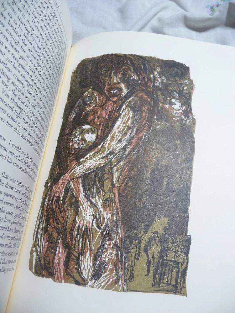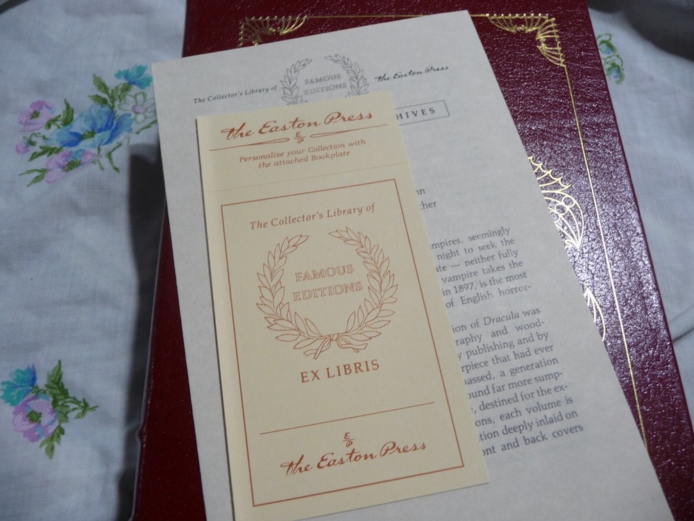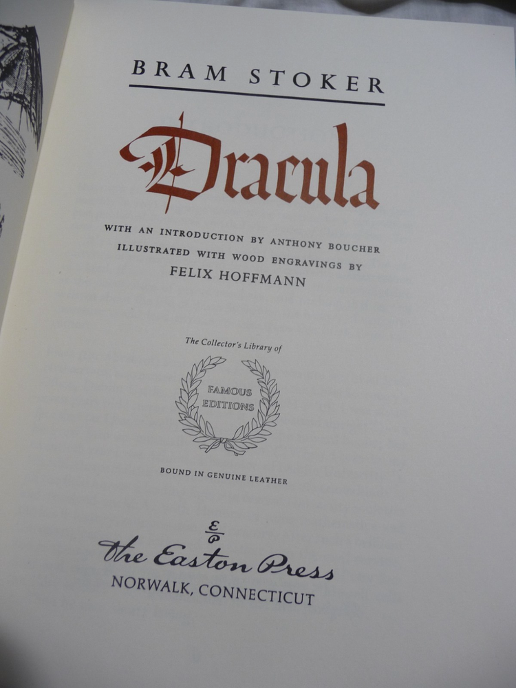 Dracula by Bram Stoker, illustrated by Felix Hoffmann. Published by Easton Press, circa 1965. The edition is from the Easton LIbrary's "Famous Editions'. Full leather, gold decorations.Silk end papers and silk book mark. Condition: minor scuffs to the gold gilt on the fore-edge and top edge otherwise in excellent un-read condition. Includes the original un-used book plate and booklet. ------- I am also listing a later 2005 edition of this same book in black leather. To view it also, just click on the " see seller's other listings" above.