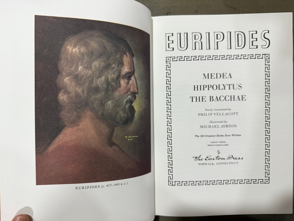 Euripides - Medea, Hippolytus, the Bacchae Easton Press 100 Greatest Series Excellent Condition; attached NEW Bookplate ! New Books get listed daily !!! 100s of Easton Press and Franklin Library books available!! All books get cleaned with a leather cleaner to remove any dust, odor and restore the beauty of leather!! Combined Shipping Discount: USA buyers - every book $1 off International combined shipping: 1 or 2 books - $45 3 or 4 books - $75 5 + books $17 per book 10+ books $13 per book WE SHIP DAILY!! RETURNS: Hassle-Free 30-days return policy and we pay for a return !! Check our Inventory (Link to eBay Store): http://stores.ebay.com/EastonFranklinBooks