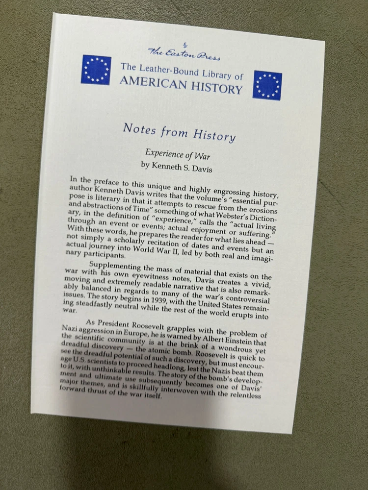 Experience Of War by Kenneth Davis 2 vol Easton Press American History Series Excellent Condition with Collectors Notes! New Books get listed daily !!! 100s of Easton Press and Franklin Library books available!! All books get cleaned with a leather cleaner to remove any dust, odor and restore the beauty of leather!! Combined Shipping Discount: USA buyers - every book $1 off International combined shipping: 1 or 2 books - $45 3 or 4 books - $75 5 + books $18 per book 10+ books $13 per book WE SHIP DAILY!! RETURNS: Hassle-Free 30-days return policy and we pay for a return !! Check our Inventory (Link to eBay Store): http://stores.ebay.com/EastonFranklinBooks