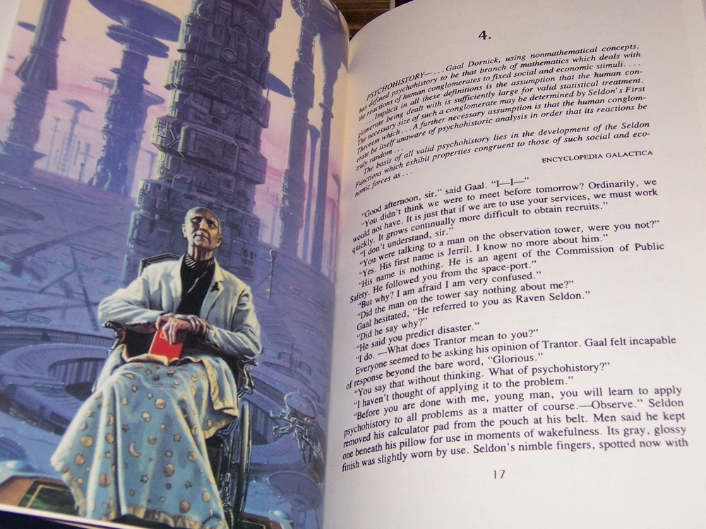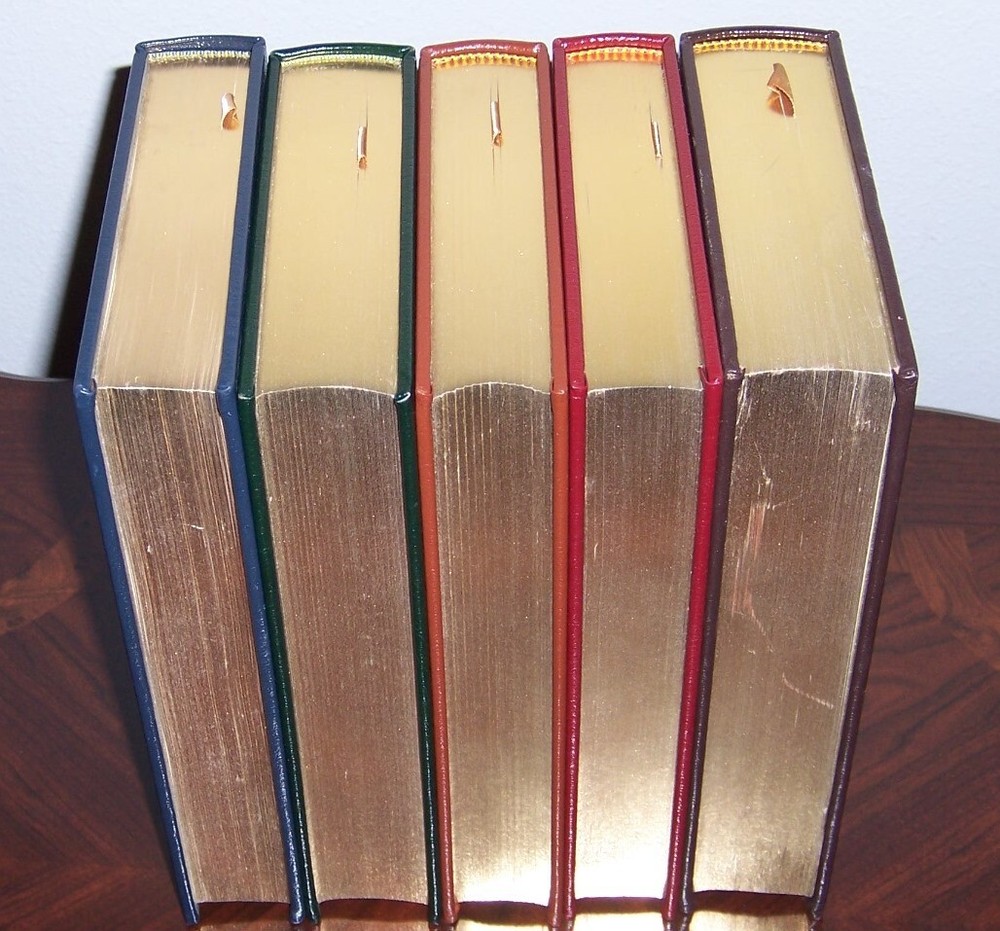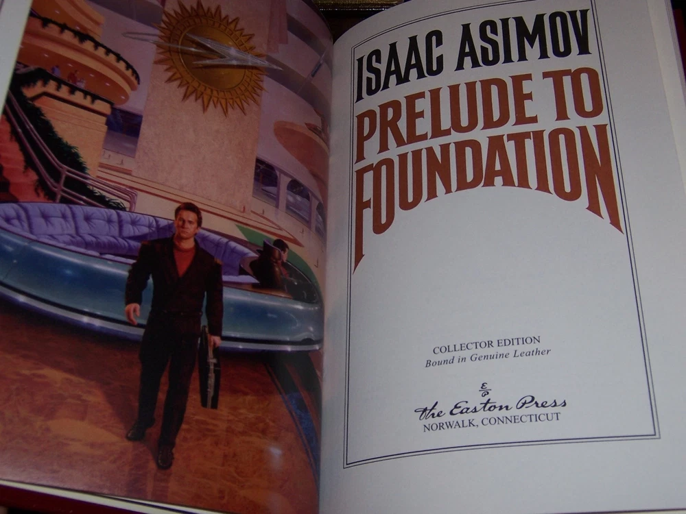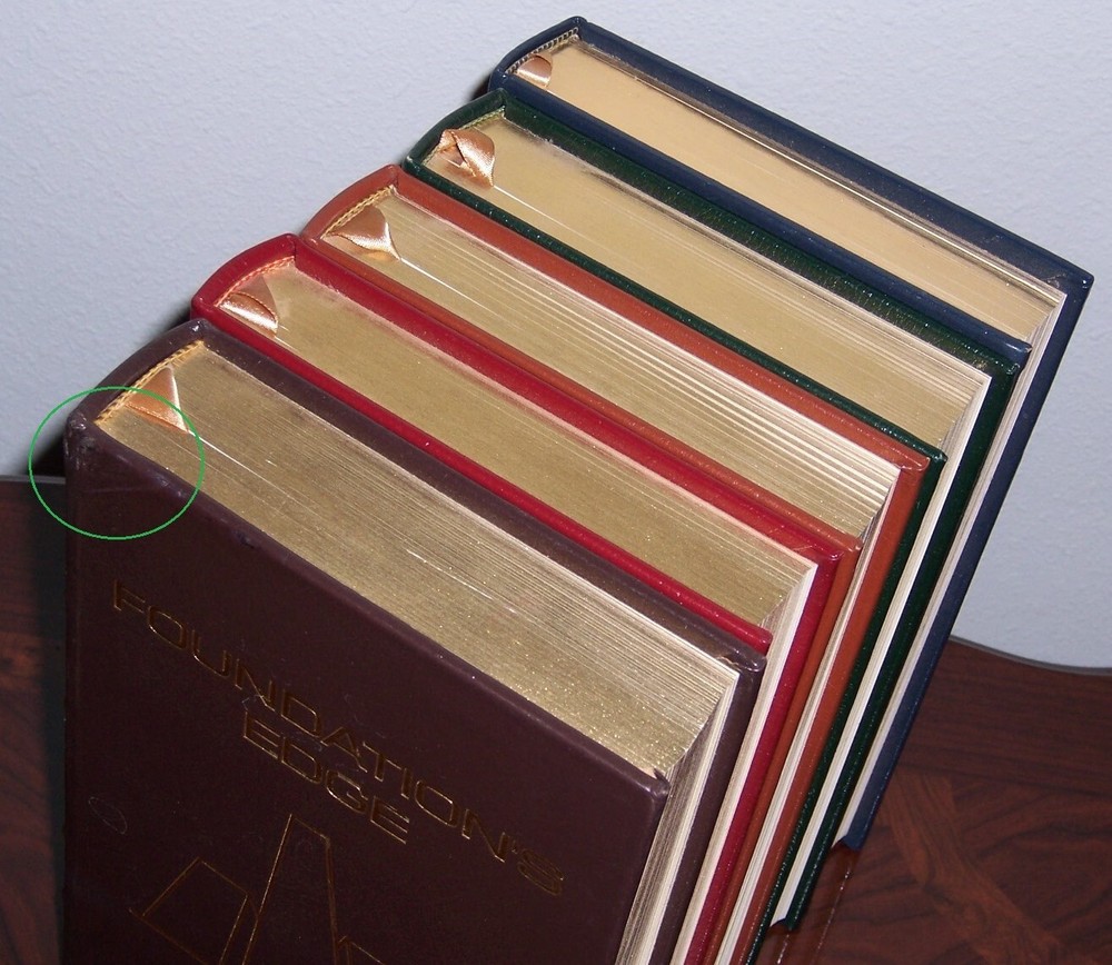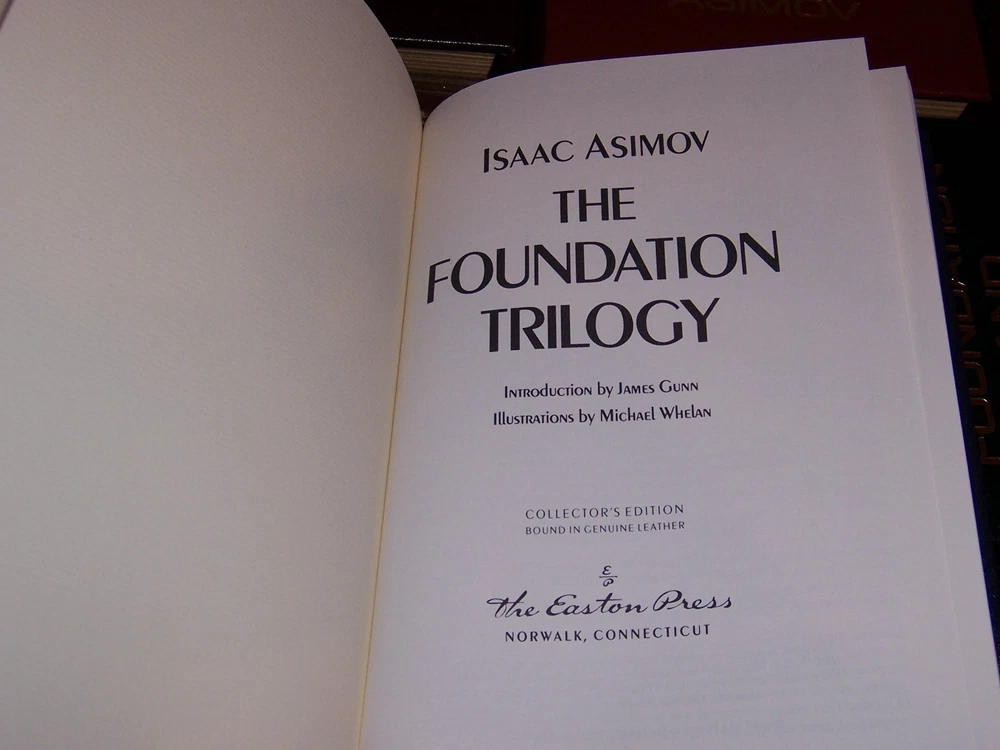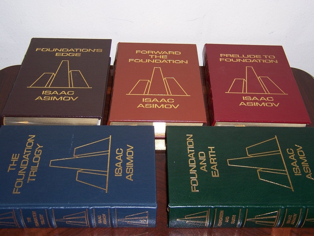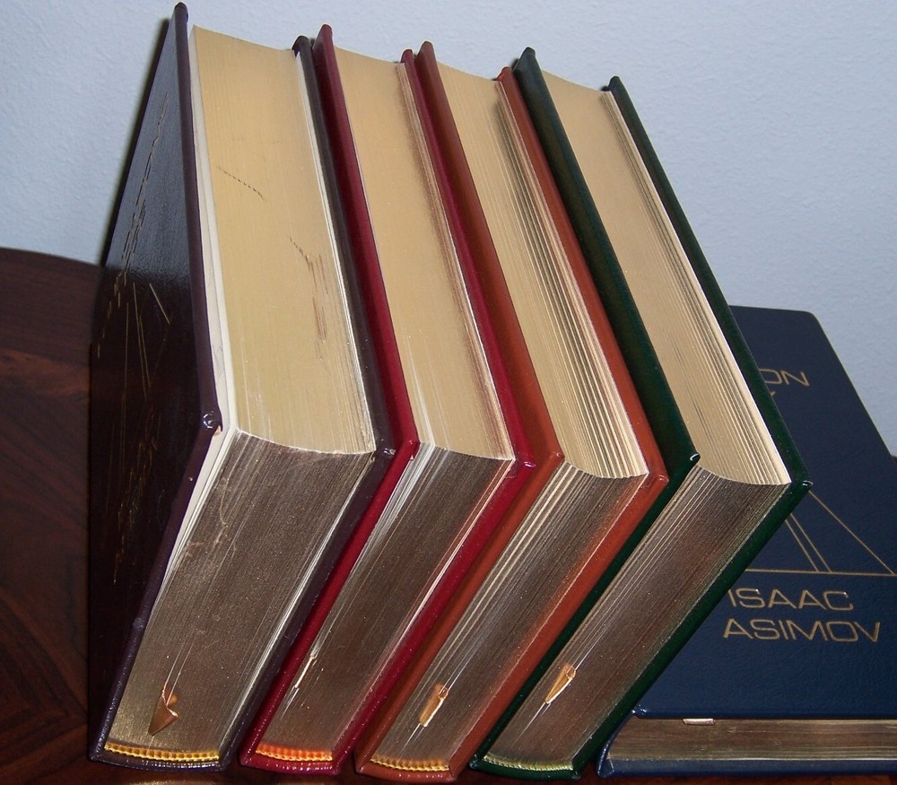 masterpiece of science fiction Easton Press FOUNDATION SERIES in 5 volumes by Isaac Asimov Uniform multi-color leather bindings, distinct cover designs with decorations with frontispiece art works in color do not miss out this good deal Copyright by The Easton Press hubbed spine, bound in premium full leathers distinctive cover design, beautiful illustrations handsome, readable typefaces, permanent satin ribbon page marker elegant gilded page edges, endsheets of patterned paper thread-sewn pages for durability and strength, long-lasting high quality, acid-neutral paper LIST OF TITLES: a series in 5 volumes: 1. FOUNDATION AND EARTH 2. PRELUDE TO FOUNDATION 3. THE FOUNDATION TRILOGY, introduction by James Gunn, illustrations by Michael Whelan 4. FORWARD THE FOUNDATION 5. FOUNDATION'S EDGE CONDITION DESCRIPTION: Like new inside and unread condition, BUT Foundation Edge book with scuff marks over gilt edges and abrasive leather surface, binding is tight and gold page edging still shiny, beautiful bright endleaves and satin ribbon page marker. This set could be a precious addition to your family library. SHIPPING / HANDLING: Book(s) will be handled/packed very safely, and shipped via USPS media mail with delivery confirmation.