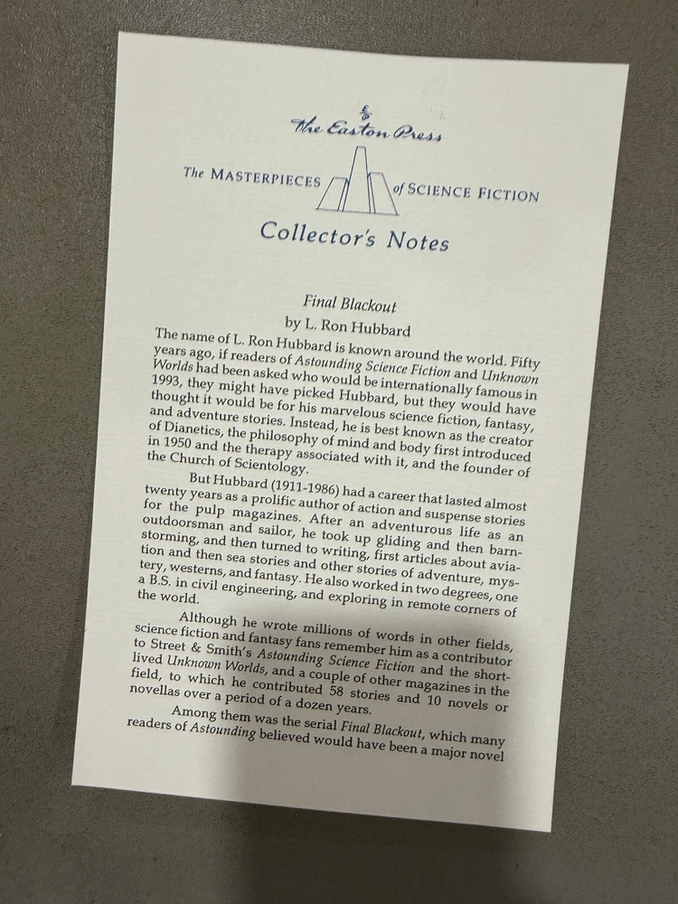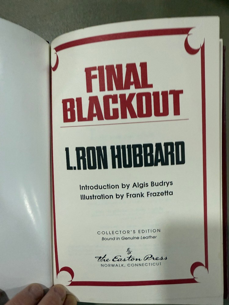 Final Blackout by L. Ron Hubbard Easton Press Sci Fi Series Very Good Plus Condition with Collectors Notes! New Books get listed daily !!! 100s of Easton Press and Franklin Library books available!! All books get cleaned with a leather cleaner to remove any dust, odor and restore the beauty of leather!! Combined Shipping Discount: USA buyers - every book $1 off International combined shipping: 1 or 2 books - $40 3 or 4 books - $70 5 + books $17 per book 10+ books $13 per book WE SHIP DAILY!! RETURNS: Hassle-Free 30-days return policy and we pay for a return !! Check our Inventory (Link to eBay Store): http://stores.ebay.com/EastonFranklinBooks