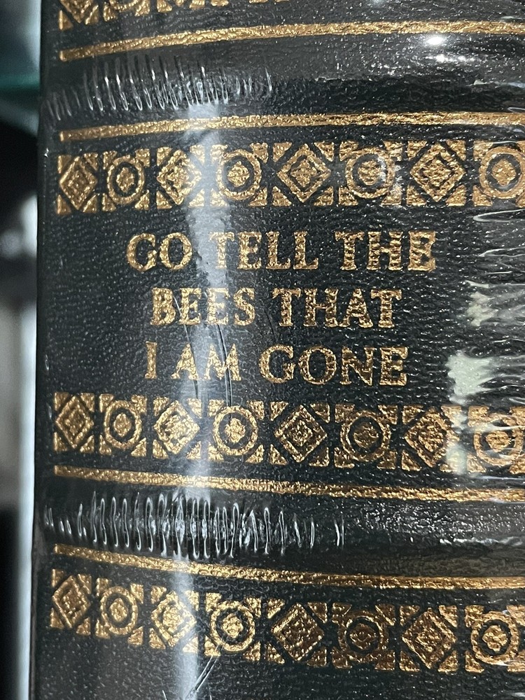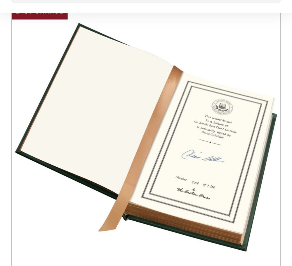 Go Tell the Bees That I am Gone Diana Gabaldon 9th Outlander Novel Numbered Edition 1350 copies 6 1/8” x 9 1/4” 912pp Features include: - Fully bound in genuine leather. - 22kt gold deeply inlaid on the “hubbed” spine. - Superbly printed on acid-neutral paper that lasts for generations. - Sewn pages – not just glued like ordinary books. - Satin-ribbon page marker. - Gilded page ends. - Bound in the USA. Imported materials.