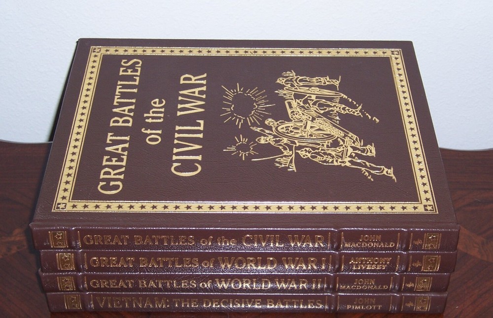Heirloom Edition Easton Press Battles series in 4 volumes various authors Stamped design on the front, with informative text and quality reproduction of photos and maps measured by 9 1/2" x 12", takes about 4" linear shelf space out of print and individual title goes as high as $125, do not miss out this good deal Copyright by The Easton Press hubbed spine, bound in premium full leathers distinctive cover design, beautiful illustrations handsome, readable typefaces, permanent satin ribbon page marker elegant gilded page edges, endsheets of rich moire fabric thread-sewn pages for durability and strength, long-lasting high quality, acid-neutral paper LIST OF TITLES: Easton Press is proud to present the most comprehensive series of historical battles, a series in 4 volumes: 1. GREAT BATTLES of the Civil War, by John MacDonald, foreword by John Keegan 2. GREAT BATTLES of World War I, by Anthony Livesey, foreword by Major-General Sir Jeremy Moore 3. GREAT BATTLES of World War II, by John MacDonald, foreword by General Sir John Hackett 4. Vietnam The decisive Battles, by John Pimlott, foreword by Shelby L Stanton CONDITION DESCRIPTION: Like new and unread condition, binding is tight and gold page edging still shiny, beautiful bright endleaves and satin ribbon page marker. This set could be a precious addition to your family library. SHIPPING / HANDLING: Book(s) will be handled/packed very safely, and shipped via USPS media mail with delivery confirmation.