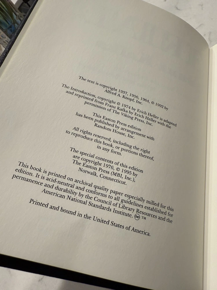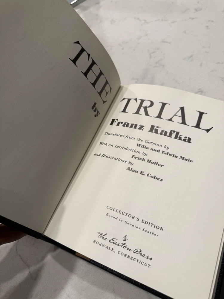 Easton Press β The Trial by Franz Kafka β Great Books of the 20th Century β NEAR MINT β GR πβοΈ Dive into the haunting world of existential uncertainty with The Trial by Franz Kafka, presented in this exquisite Easton Press leather-bound edition from the Great Books of the 20th Century series. Details: β Title: The Trial β Author: Franz Kafka β Publisher: Easton Press β Series: Great Books of the 20th Century β Bound in Genuine Leather with Gilt Edges β Hubbed Spine, Satin Ribbon Marker, Acid-Free Archival Paper π― Condition β NEAR MINT: Book is in excellent condition with minimal shelf wear Pages are clean, binding is tight No writing, marks, or bookplate π A beautiful addition to any Kafka fanβs library or Easton Press collection π Fast Shipping & Secure Packaging! Thanks for looking! β RetroMementos