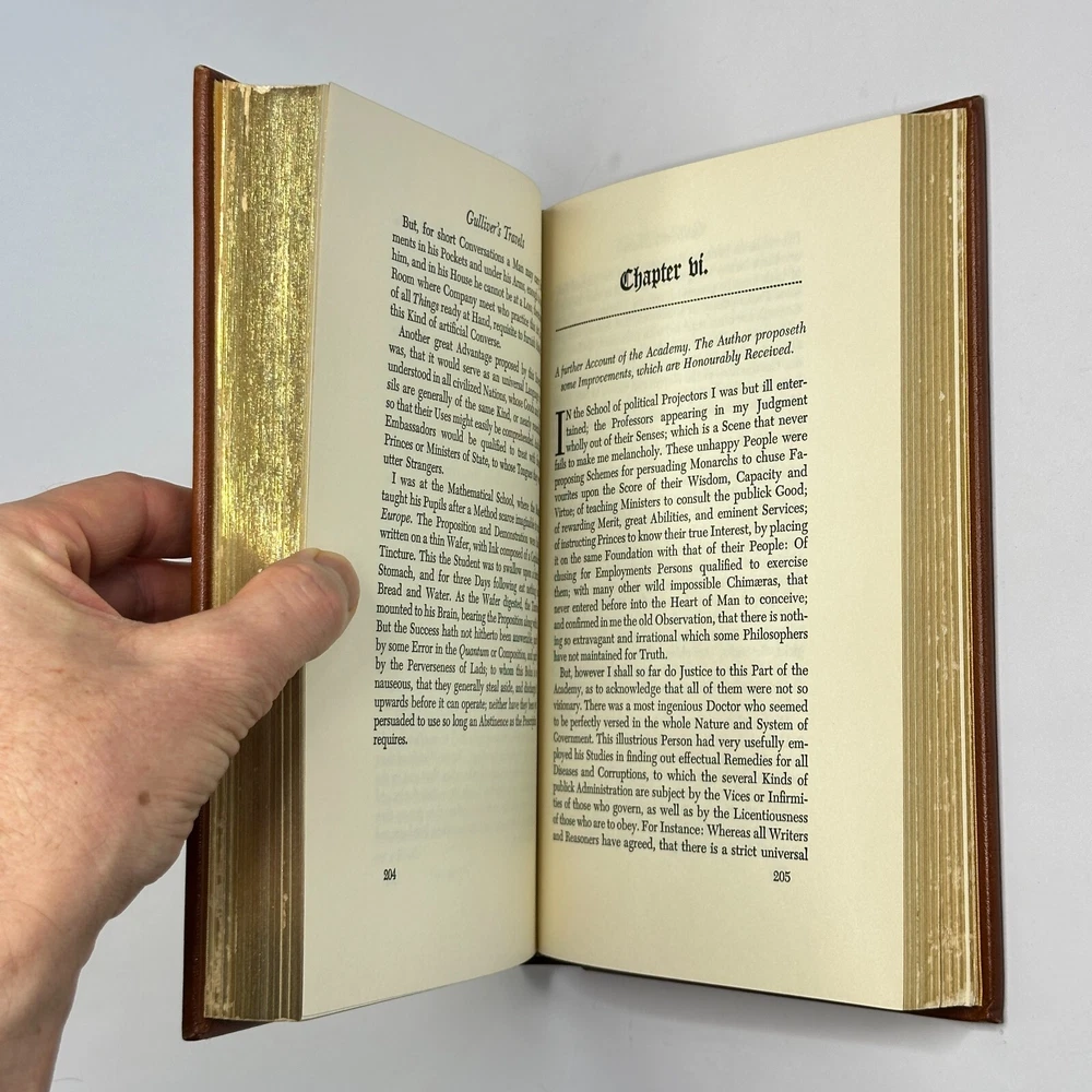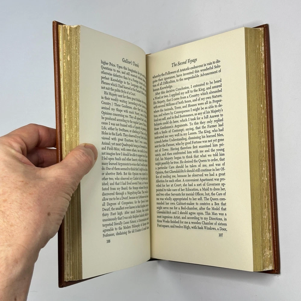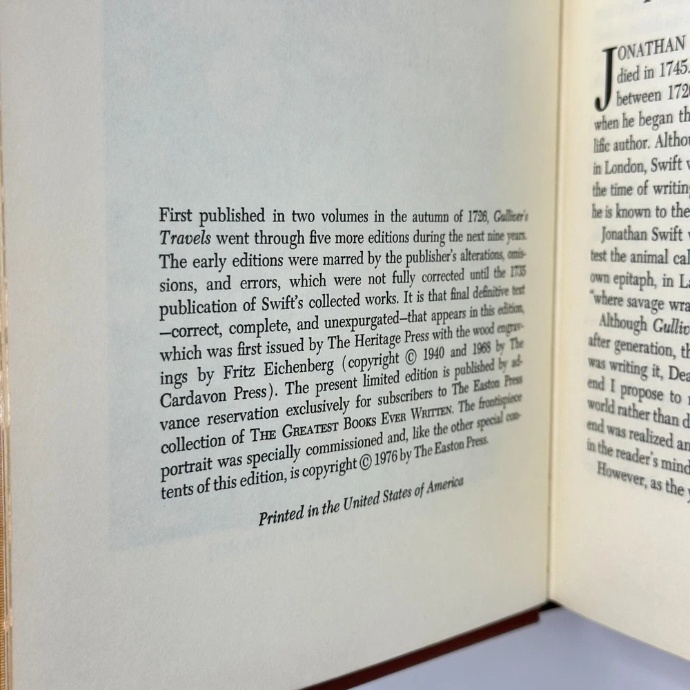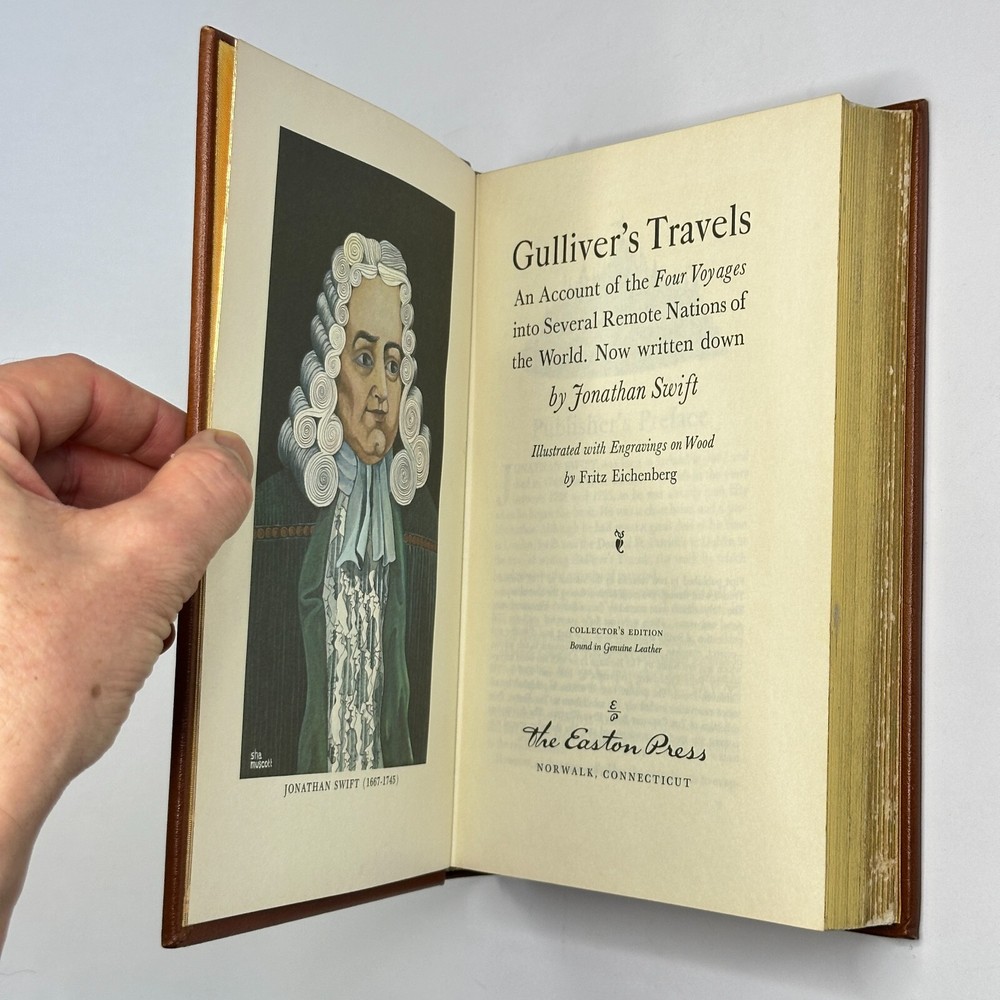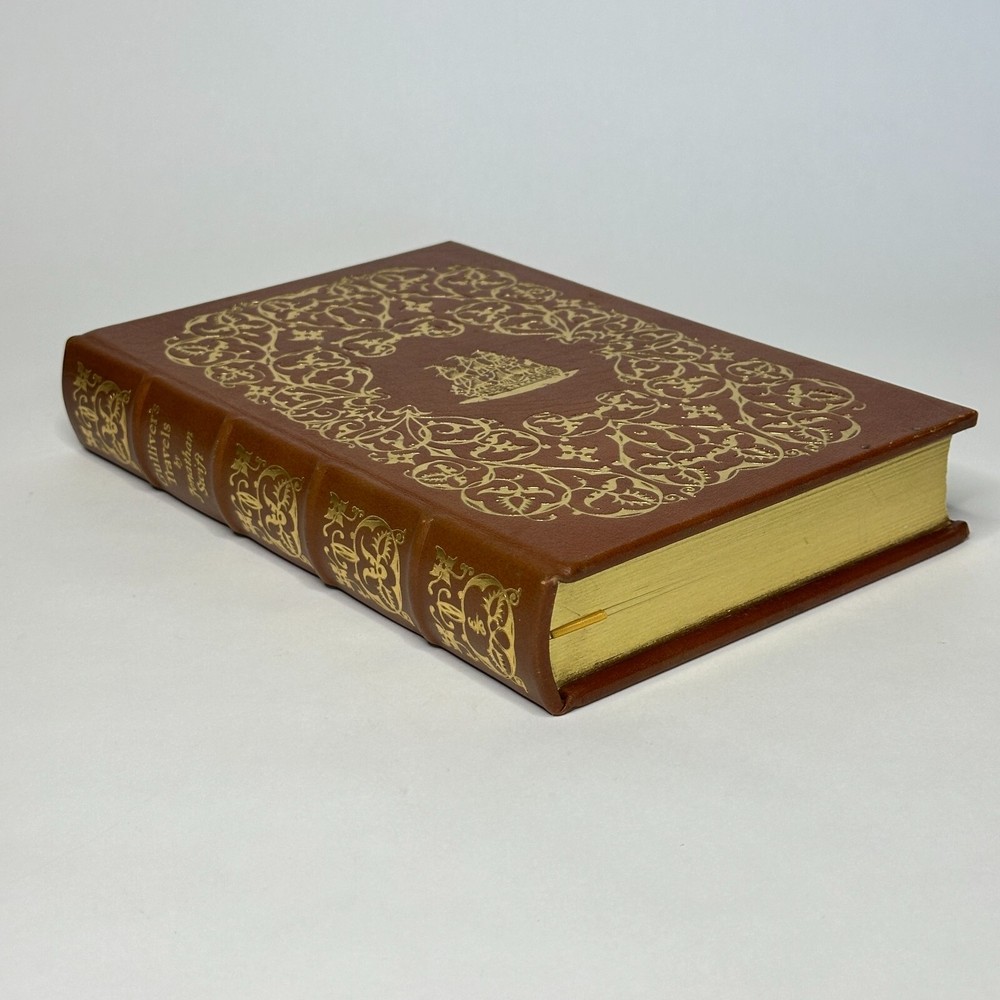 "Gulliver's Travels" Jonathan Swift 1976 Easton Press Leather Bound Size: 6.5" x 9.5" This satirical novel tells the story of Lemuel Gulliver, an English surgeon who embarks on a series of extraordinary voyages to fantastical lands. Through his adventures in Lilliput, Brobdingnag, Laputa, and the land of the Houyhnhnms, Swift critiques contemporary society and human nature. See pictures for condition references and please ask any questions before purchasing! ----------- Orders are carefully packed and shipped in boxes using USPS Media Mail. Orders placed before 2pm ET are shipped the same business day, unless we are away sourcing additional inventory. We combine shipping on orders with multiple items.