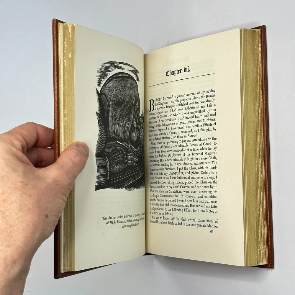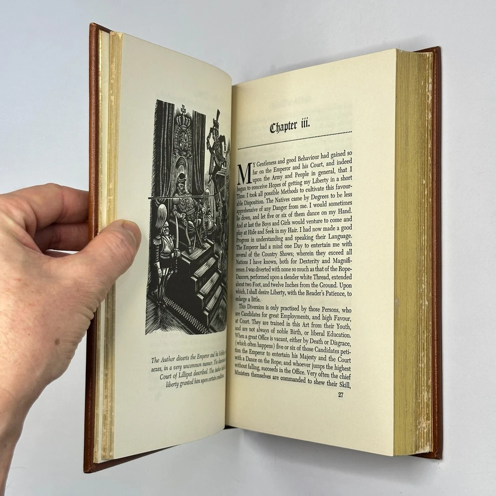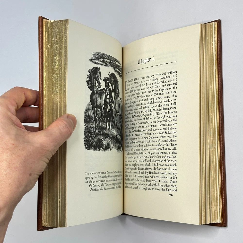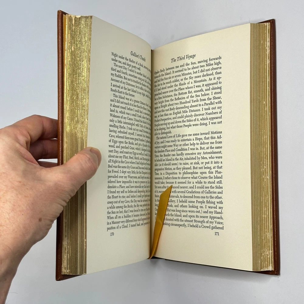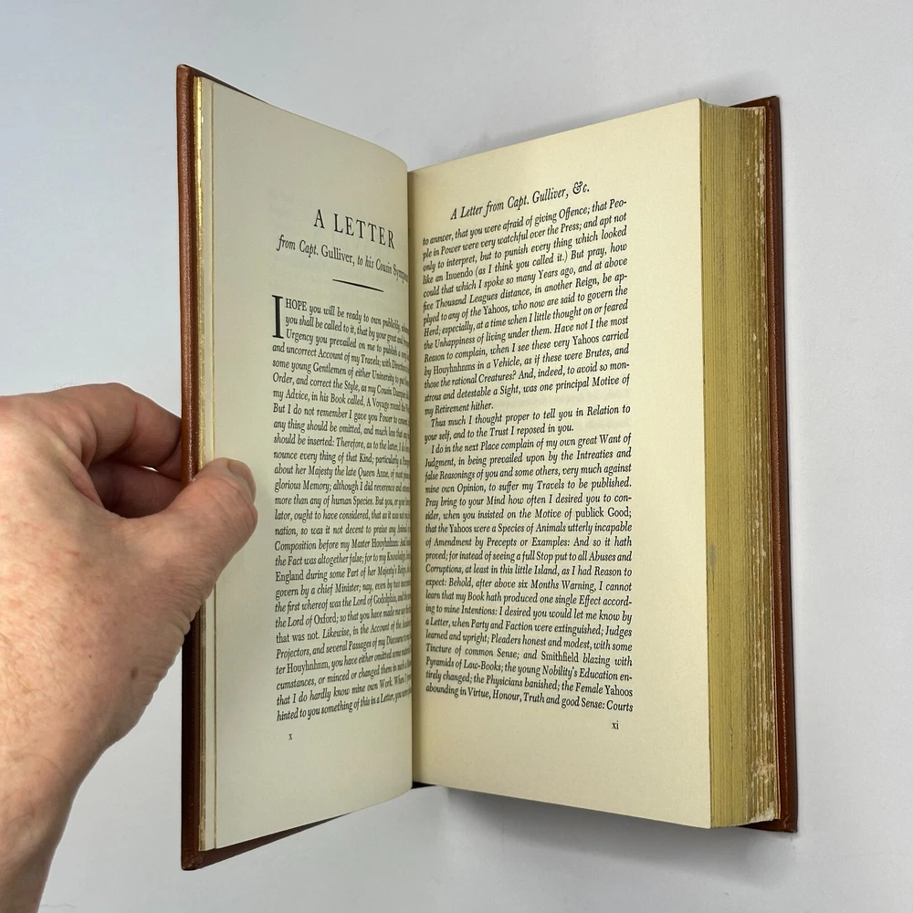 "Gulliver's Travels" Jonathan Swift 1976 Easton Press Leather Bound Size: 6.5" x 9.5" This satirical novel tells the story of Lemuel Gulliver, an English surgeon who embarks on a series of extraordinary voyages to fantastical lands. Through his adventures in Lilliput, Brobdingnag, Laputa, and the land of the Houyhnhnms, Swift critiques contemporary society and human nature. See pictures for condition references and please ask any questions before purchasing! ----------- Orders are carefully packed and shipped in boxes using USPS Media Mail. Orders placed before 2pm ET are shipped the same business day, unless we are away sourcing additional inventory. We combine shipping on orders with multiple items.