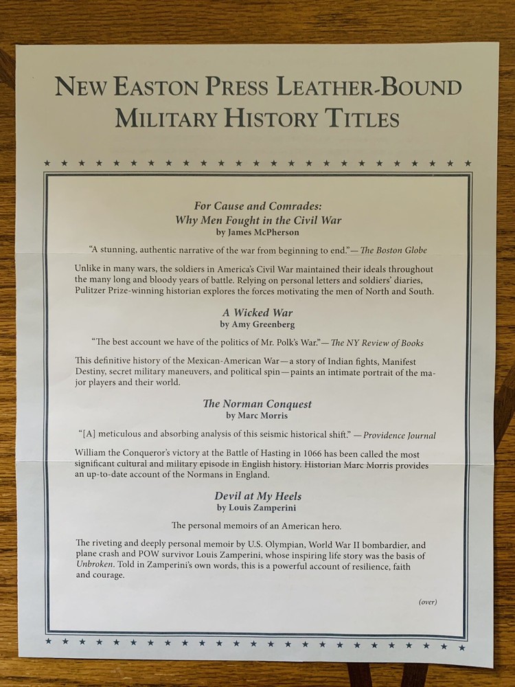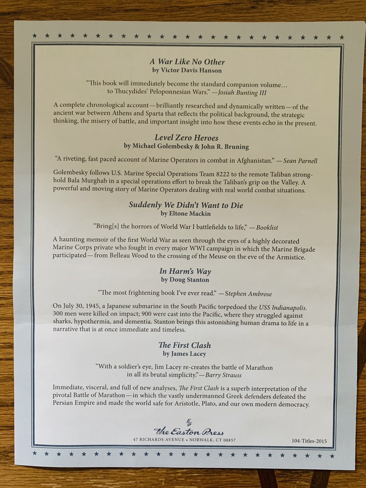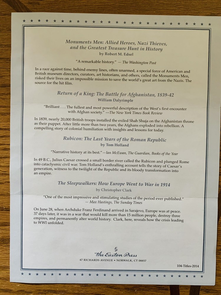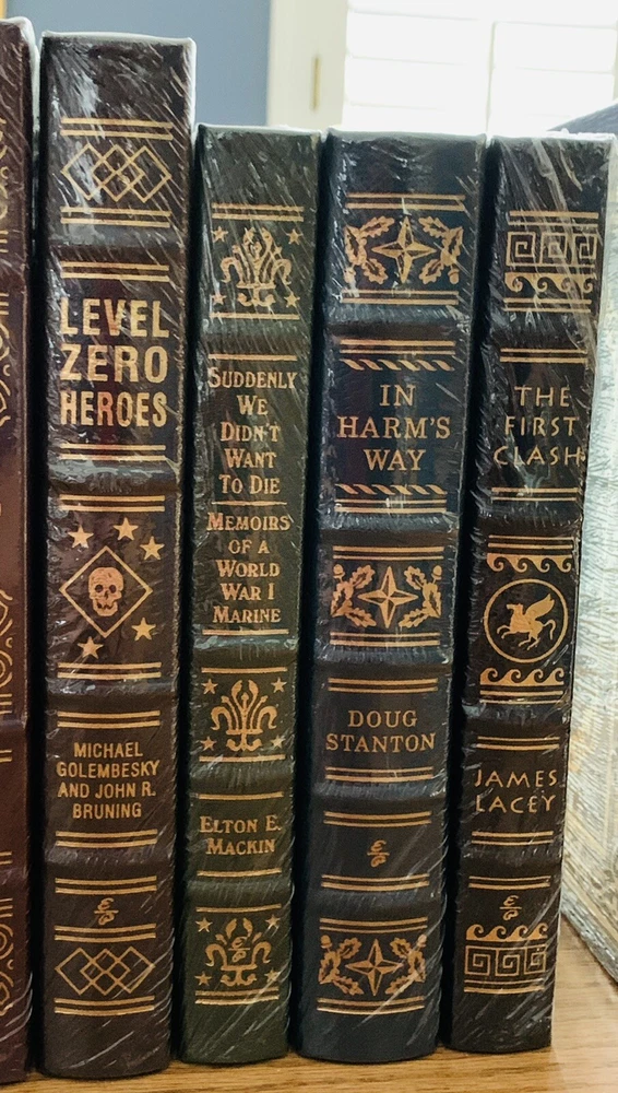 You will receive 20 sealed and beautiful books from Easton Press included in their Library of Military History. They were additions to the initial library titles. Please see the photos for descriptions of the volumes. 10 volumes are from 2014 and 9 volumes are from 2015. In addition, you will receive an extra volume- Schindler’s List - which is a signed edition. I am the original owner and have all of the unused bookplates and receipts. These have been stored sealed since they were purchased and will be well packaged for shipping. Returns will only be accepted if the books remain in their sealed and current physical condition. Let me know if you have any questions. Thank you for looking.