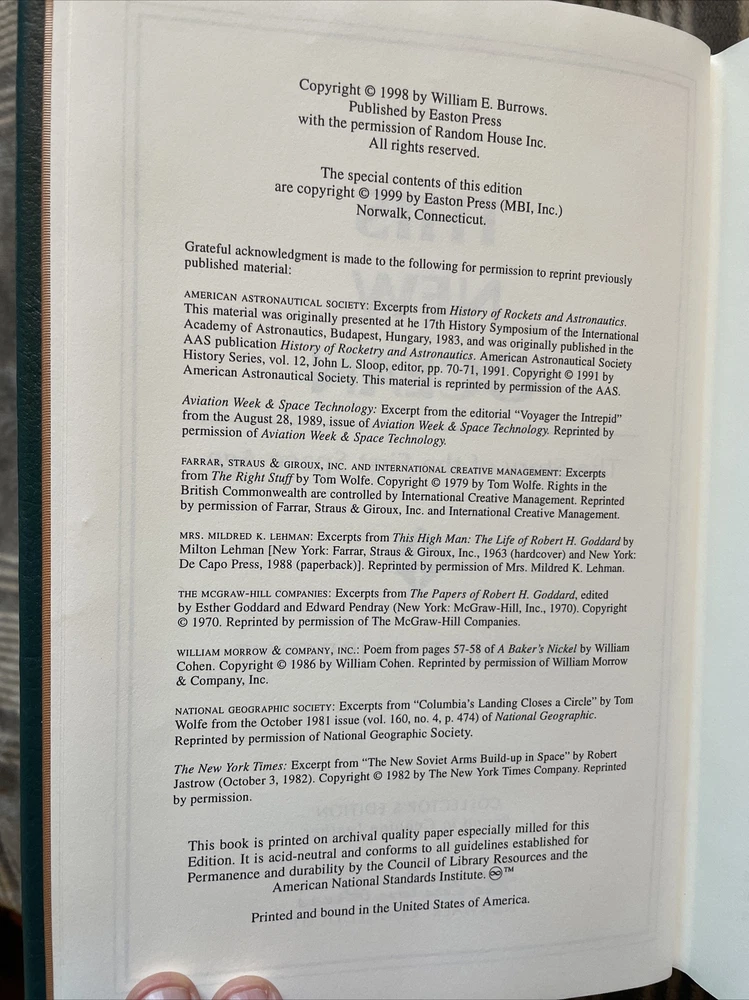 Easton Press Leather This New Ocean by William E Burrows- Collector's Ed 1999 See pictures. The Leather cover is in very good condition with a little wear. The gold gilding on the edges of the pages are very good with only a little wear. Best part of this book is the pages are clean and well taken care of. The binding is tight and firm.