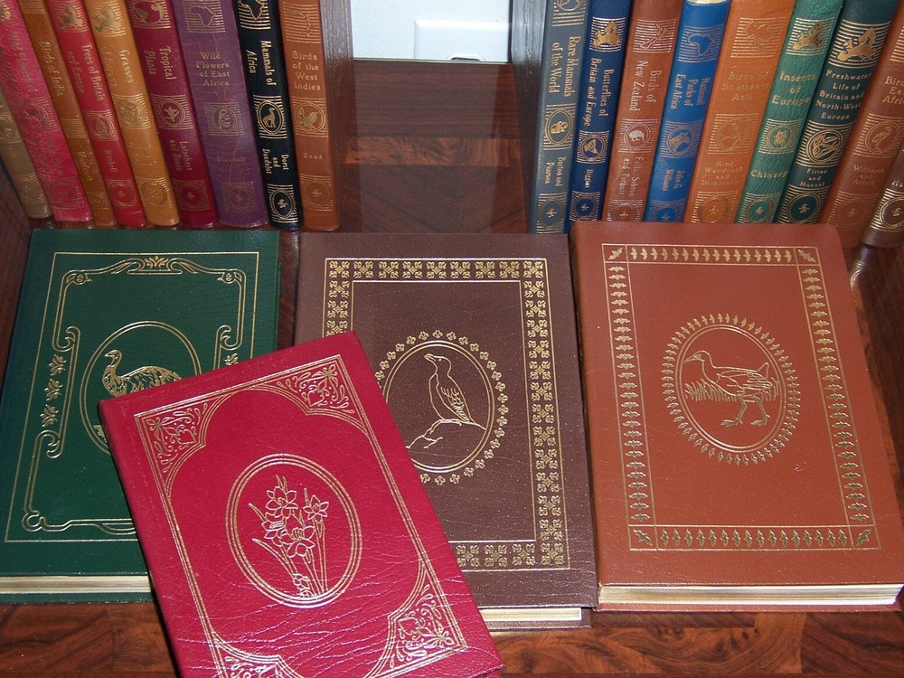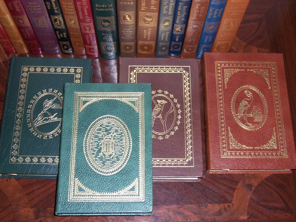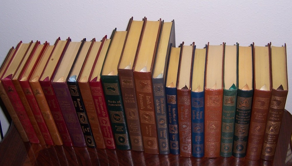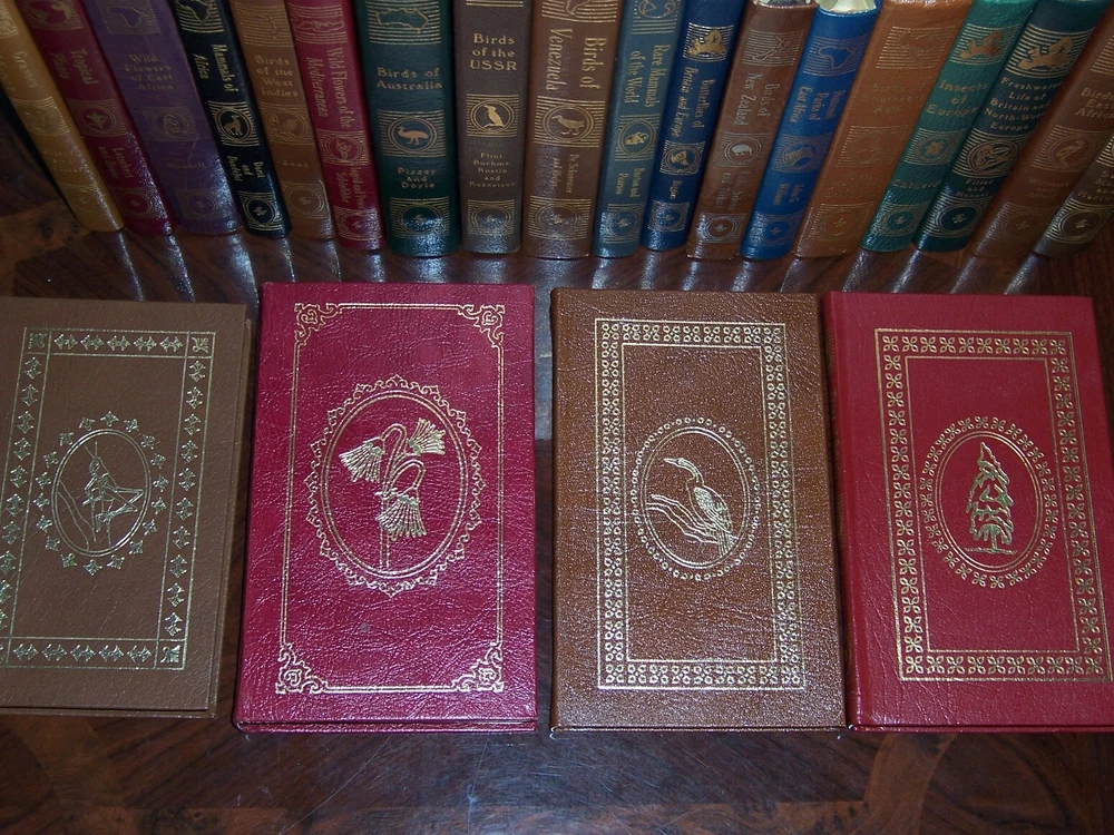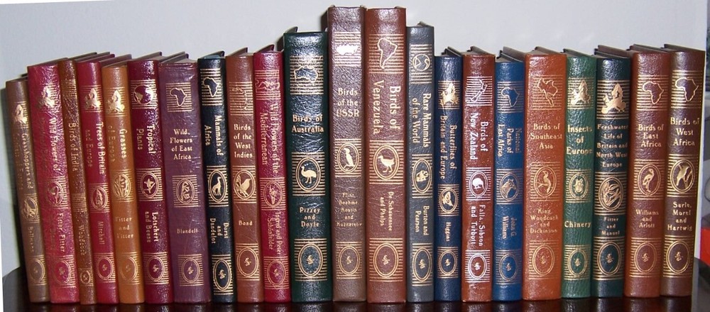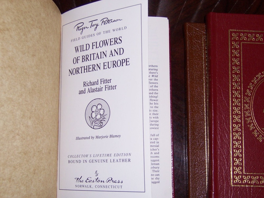 Collector's Lifetime Edition Easton Press ROGER TORY PETERSON FIELD GUIDES OF THE WORLD in 22 vols Fully illustrated with fine drawings, pictures, and maps most measured by 5 1/4" x 7 3/4", a few larger Out-of-print, do not miss out this good deal Copyright by The Easton Press hubbed spine, bound in premium full flex leathers distinctive cover design, beautiful illustrations handsome, readable typefaces, permanent satin ribbon page marker elegant gilded page edges, paper endsheets thread-sewn pages for durability and strength, long-lasting high quality, acid-neutral paper LIST OF TITLES: A popular and influential series of the World's field guides intended to assist the layman in identification of birds, plants, insects and other natural phenomena. The series was created and edited by renowned ornithologist Roger Tory Peterson, in 22 volume set: 1. Grasshoppers and Crickets of Britain and Northern Europe, by Heiko Bellmann, translated by Binky Ragge, 1991 2. Wild Flowers of Britain and Northern Europe, by Richard Fitter and Alastair Fitter, illustrated by Marjorie Blamey, 1990 3. Trees of Britain and Northern Europe, by Alan Mitchell, illustrated by John Wilkinson, 1991 4. Butterflies of Britain and Europe, by Lionel G. Higgins, illustrated by Brian Hargreaves, 1991 5. Freshwater Life of Britain and North West Europe, by Richard Fitter and Richard Manuel, 1991 6. Insects of Europe, by Michael Chinery, with 60 color plates by Gordon Riley, Denys Ovenden, and Brian Hargreaves, 1989 7. Tropical Plants, by Wilhelm Lotschert and Gerhard Beese, translated by Clive King, 1990 8. Wild Flowers of the Mediterranean, by Ingrid and Peter Schonfelder, translated from the German by Clive J King, 1990 9. National Parks of East Africa, by John G. Williams, with 24 color plates and 5 black and white plates by Norman Arlot and Rena Fennessy, 1990 10. The Mammals of Africa, by Jean Dorst and Pierre Dandelot, with 44 color plates, 1989 11. Wild Flowers of East Africa, by Sir Michael Blundell, K.B.E., 1989 12. Birds of East Africa, by John G. Williams, foreword by Roger Tory Peterson, illustrated by Norman Arlot, 1990 13. Birds of West Africa, by Dr. William Serle and Dr. Gerard J. Morel, with 48 plates by Wolfgang Hartwig, 1991 14. Birds of Indian Sub-Continent, by Martin W. Woodcock, written and illustrated by Martin W Woodcock, 1991 15. Birds of the West Indies, by James Bond, with color illustrations by Don R Eckelberry and Arthur B Singer, and line drawings by Earl L Poole, 1990 16. Birds of New Zealand, by R.A. Falla, R.B. Sibson and E.G. Turbott, illustrated by Elaine Power, 1990 17. Birds of Southeast Asia, by Ben F. King and Edward C. Dickson, illustrated by Martin W Woodcock, 1989 18. Birds of the USSR, Including Eastern Europe and Central Asia, by V.E. Flint, R.L. Boehme, Y.V, Kostin, A.A. Kuznetsov, illustrated by Y V Kostin, 1991 19. Birds of Australia, by Graham Pizzey, illustrated by Roy Doyle, 1991 20. Birds of Venezuela by Rodolphe Meyer De Schauensee and William H. Phelps Jr., Illustrated by Guy Tudor with line drawings by Michael Kleinbaum, 1991 21. Grasses, Sedges, Rushes and Ferns of Britain and Northern Europe, by Richard and Alastair Fitter, illustrated by Ann Farrer, 1984 22. Rare Mammals of the World, by John A Burton, illustrated by Bruce Pearson, foreward by Sir Petter Scott, 1990 CONDITION DESCRIPTION: Like new and unread condition, blank unattached bookplates with distinct design, exquisitely bound in genuine leather. This set could be a precious addition to your family library. SHIPPING / HANDLING: Book(s) will be handled/packed very safely, and shipped via USPS media mail with delivery confirmation.