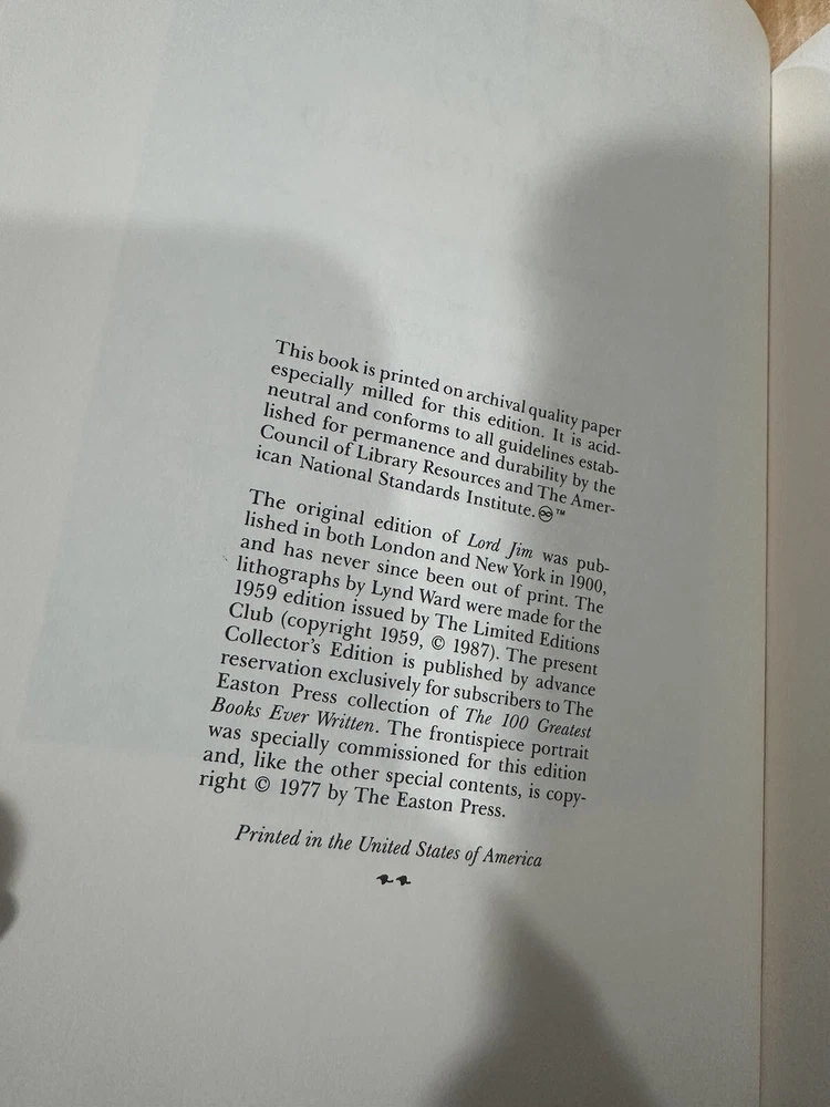 Delve into the depths of "Lord Jim" by Joseph Conrad, a masterpiece that's bound to captivate readers with its rich narrative and profound characters. This edition, part of the 100 Greatest Series by Easton Press, is presented in an elegant leather-bound format that exudes a sense of timeless sophistication. It's a must-have for enthusiasts of classic literature and collectors alike. Crafted with care in the United States, this collector's edition not only showcases the linguistic prowess of Conrad but also serves as a tangible piece of literary history. It's a fine addition to any collection that cherishes the classics, offering a luxurious escape into the worlds of literature and fiction.