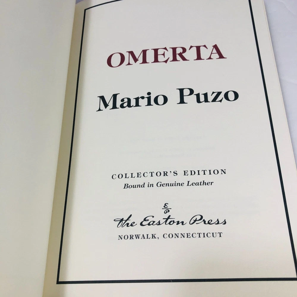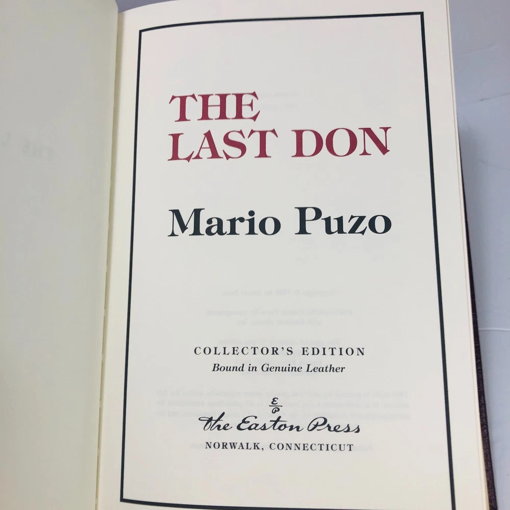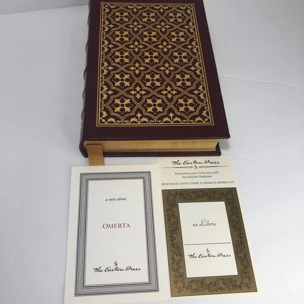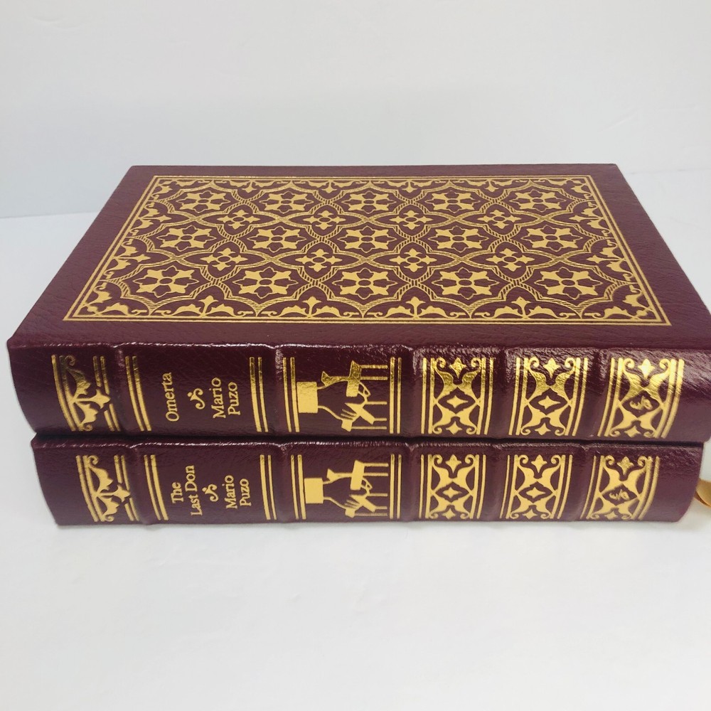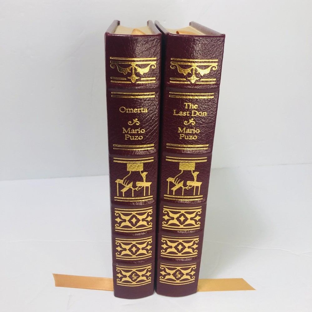 Mario Puzo Godfather Series: 2 HB Leather Books The Last Don, Omerta Easton press EASTON PRESS Books The Godfather Series by Mario Puzo Lot of 2 beautiful maroon-colored leather collector books in the Godfather series from 2003. Gilded pages. Ribbon page markers. Includes Easton Press blank bookplates for each book. The titles in the lot include: * The Last Don * Omerta (includes card with "Note About Omerta") CONDITION: USED but in good condition. Some scuffs in gilding on one book (see photos). Thanks for looking!