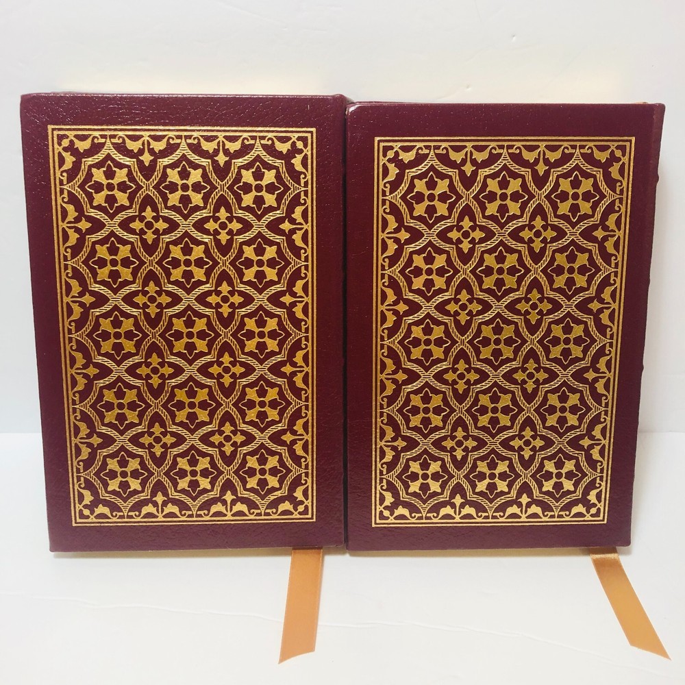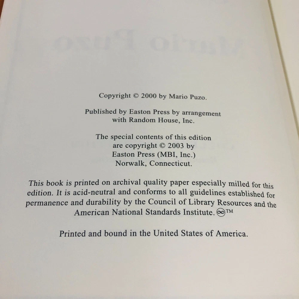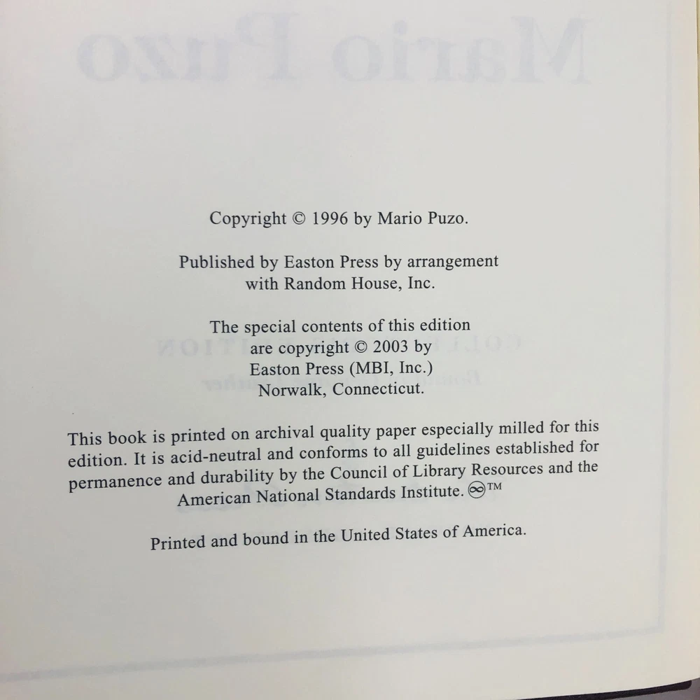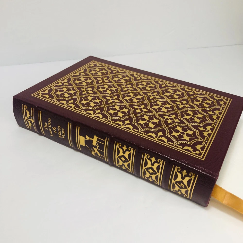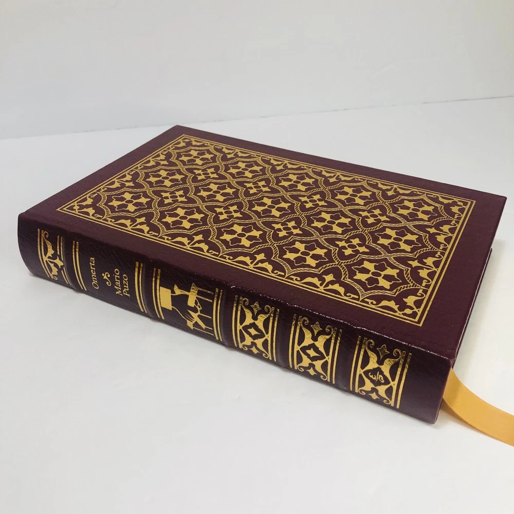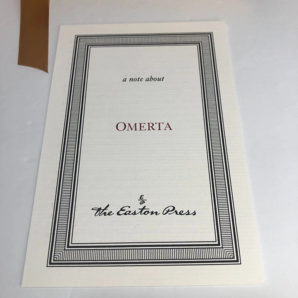 Mario Puzo Godfather Series: 2 HB Leather Books The Last Don, Omerta Easton press EASTON PRESS Books The Godfather Series by Mario Puzo Lot of 2 beautiful maroon-colored leather collector books in the Godfather series from 2003. Gilded pages. Ribbon page markers. Includes Easton Press blank bookplates for each book. The titles in the lot include: * The Last Don * Omerta (includes card with "Note About Omerta") CONDITION: USED but in good condition. Some scuffs in gilding on one book (see photos). Thanks for looking!