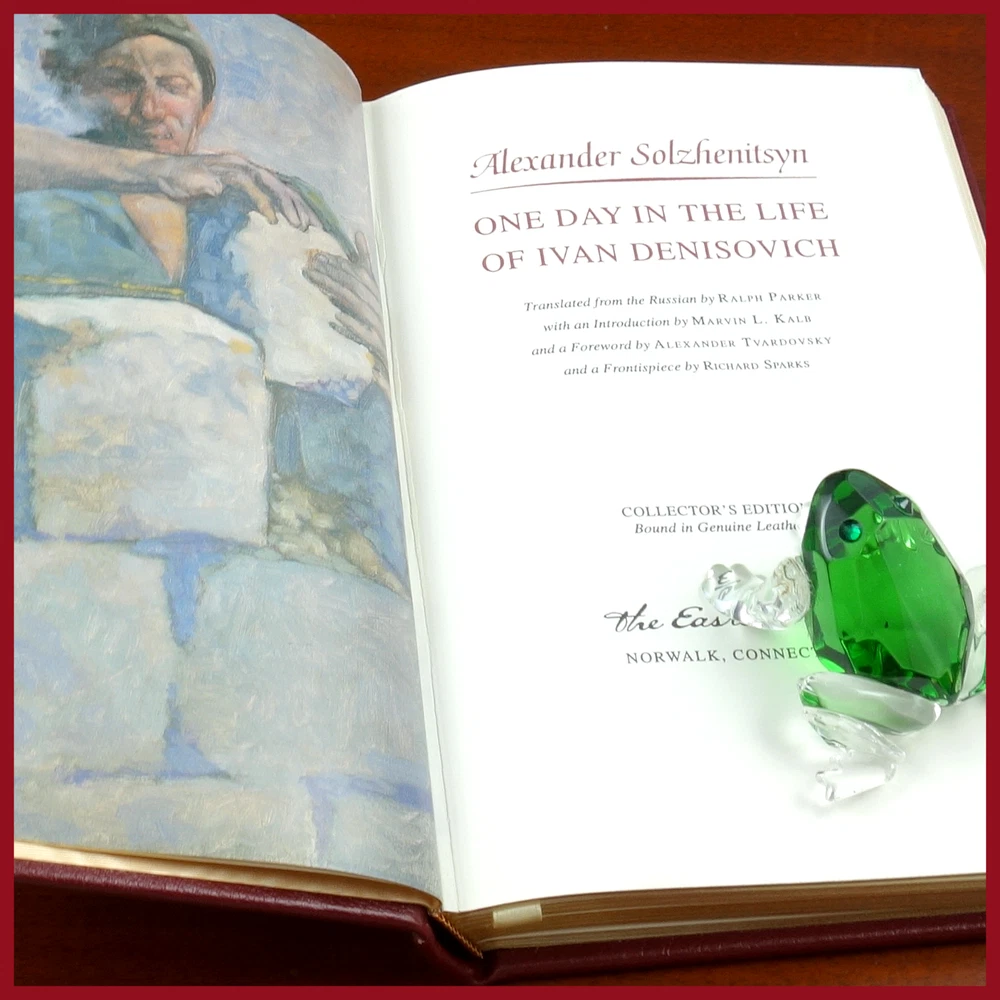 We recently purchased a large collection of Easton Press books to be listed in the coming weeks. Stay tuned for the chance to pick up some collectible titles. This text was featured in the Easton Press series Great Books of the 20th Century. Published in 1988, bound in handsome Burgundy leather, and with a beautiful frontispiece illustration by Richard Sparks, this edition would be a worthy addendum to your collectibles library. Specifics of this series from the Easton Press website: Fully and tightly bound in genuine leather 22kt gold accents deeply inlaid on the "hubbed" spine.* Heavy duty binding boards... . Superbly printed on acid-neutral paper... . Sewn pages – not just glued like ordinary books. ...moiré endpages and a satin-ribbon page marker. Gilded page ends. ******************************************************************************************************************* ". . . One Day in the Life of Ivan Denisovich is an undisputed classic of contemporary literature. First published (in censored form) in the Soviet journal Novy Mir in 1962, it is the story of labor-camp inmate Ivan Denisovich Shukhov as he struggles to maintain his dignity in the face of communist oppression. On every page of this graphic depiction of Ivan Denisovich's struggles, the pain of Aleksandr Solzhenitsyn's own decade-long experience in the gulag is apparent—which makes its ultimate tribute to one man's will to triumph over relentless dehumanization all the more moving." ///////////////////////////////////////////////////////////////////////////////////////////////////////////////////////////////////////////////////////// Aleksandr Isayevich Solzhenitsyn (11 December 1918 – 3 August 2008) was a Russian writer and prominent Soviet dissident who helped to raise global awareness of political repression in the Soviet Union, especially the Gulag prison system. . . . While serving as a captain in the Red Army during World War II, Solzhenitsyn was arrested by SMERSH and sentenced to eight years in the Gulag and then internal exile for criticizing Soviet leader Joseph Stalin in a private letter. . . . As a result of the Khrushchev Thaw, Solzhenitsyn was released and exonerated. He pursued writing novels about repression in the Soviet Union and his experiences. He published his first novel, One Day in the Life of Ivan Denisovich in 1962, with approval from Soviet leader Nikita Khrushchev, which was an account of Stalinist repressions. . . . He continued to work on further novels and their publication in other countries including Cancer Ward in 1966, In the First Circle in 1968, August 1914 in 1971, and The Gulag Archipelago in 1973, the publication of which outraged Soviet authorities. In 1974, Solzhenitsyn was stripped of his Soviet citizenship and flown to West Germany. In 1976, he moved with his family to the United States, where he continued to write. . . . He was awarded the 1970 Nobel Prize in Literature "for the ethical force with which he has pursued the indispensable traditions of Russian literature", and The Gulag Archipelago was a highly influential work that "amounted to a head-on challenge to the Soviet state", and sold tens of millions of copies. The above text was taken from, respectively, Farrar, Straus & Giroux publishing (via Google Books) and Wikipedia. [Solzhenitsyn, Aleksandr. One Day in the Life of Ivan Denisovich: A Novel. United States: Farrar, Straus and Giroux, 2005.]