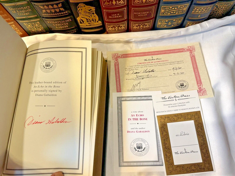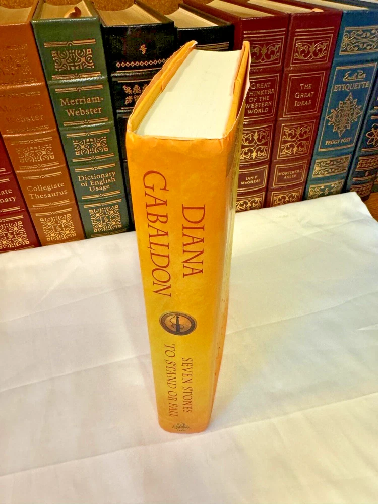This is the complete set of Diana Gabaldon's " Outlander Series" in 9 volumes. "Seven Stones to Stand or Fall" is included as a brand new Delacorte Press volume, NOT Easton Press and NOT signed . On the lower page ends of the "Seven Stones" volume there is a stamp. They are all unread and in "like new" condition with the shrink wrap removed. All of the Easton Press books are signed by the author and each one comes with the "Certificate of Authenticity," note card, and an unattached bookplate. The titles included: Outlander Dragonfly in Amber Voyager Drums of Autumn The Fiery Cross A Breath of Snow and Ashes An Echo in the Bone Written in my Own Hearts Bood Go Tell the Bees That I Am Gone All photos were taken by me of the actual books listed. They are part of the description of the books, so please review carefully. The books are sold As-Is. If you have any questions, please contact me and I will try to answer as best as I am able. I am not a commercial seller. I do not accept returns. If there are any issues, please contact me through eBay. Shipped insured with a signature required from a pet and smoke-free home. I am more than happy to combine shipping for multiple purchases. Please do not pay for your order before contacting me so I can send an invoice with the adjusted shipping cost. I only accept payment through eBay. Thank you very much for looking!